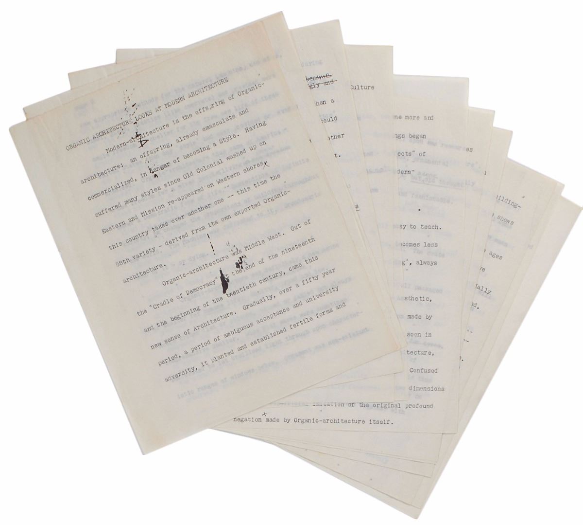 Hand-corrected typed manuscript draft for an article entitled “Organic Architecture Looks at Modern Architecture,” unsigned, seventeen pages, 8.5 x 11, February 1952. Fascinating draft with over one hundred edits and corrections in Wright’s hand. In part: “Modern-architecture is the offspring of Organic-architecture: an offspring, already emasculate and commercialized, in danger of becoming a style. Having suffered many styles since Old Colonial washed up on Eastern and Mission re-appeared on Western shores this country takes over another one—this time the 68th variety—derived from its own exported Organic-architecture…Modern-architecture is Organic-architecture deprived of a soul. Therefore architecture so easy to grasp that any boy of three month's experience can practice and appear with a dose of it on the front page of the local newspaper next month or within a year (or two) be heralded in color by the market-magazines of building materials as the new ‘It.’ Plan-factories now have shows in Art-Museums.” In fine condition, with stray ink blots to the first page. Wright’s final article appeared in the May 1952 issue of Architectural Record.