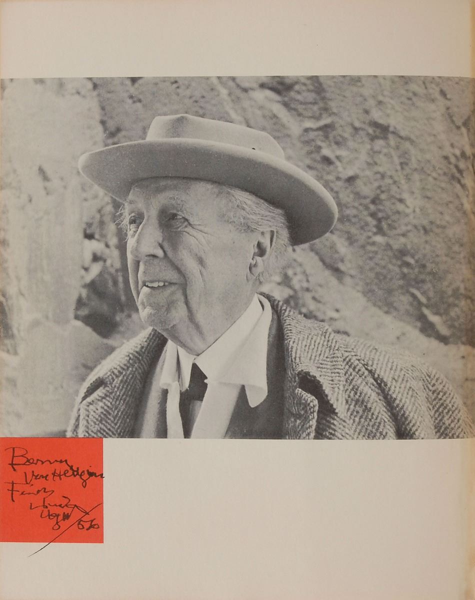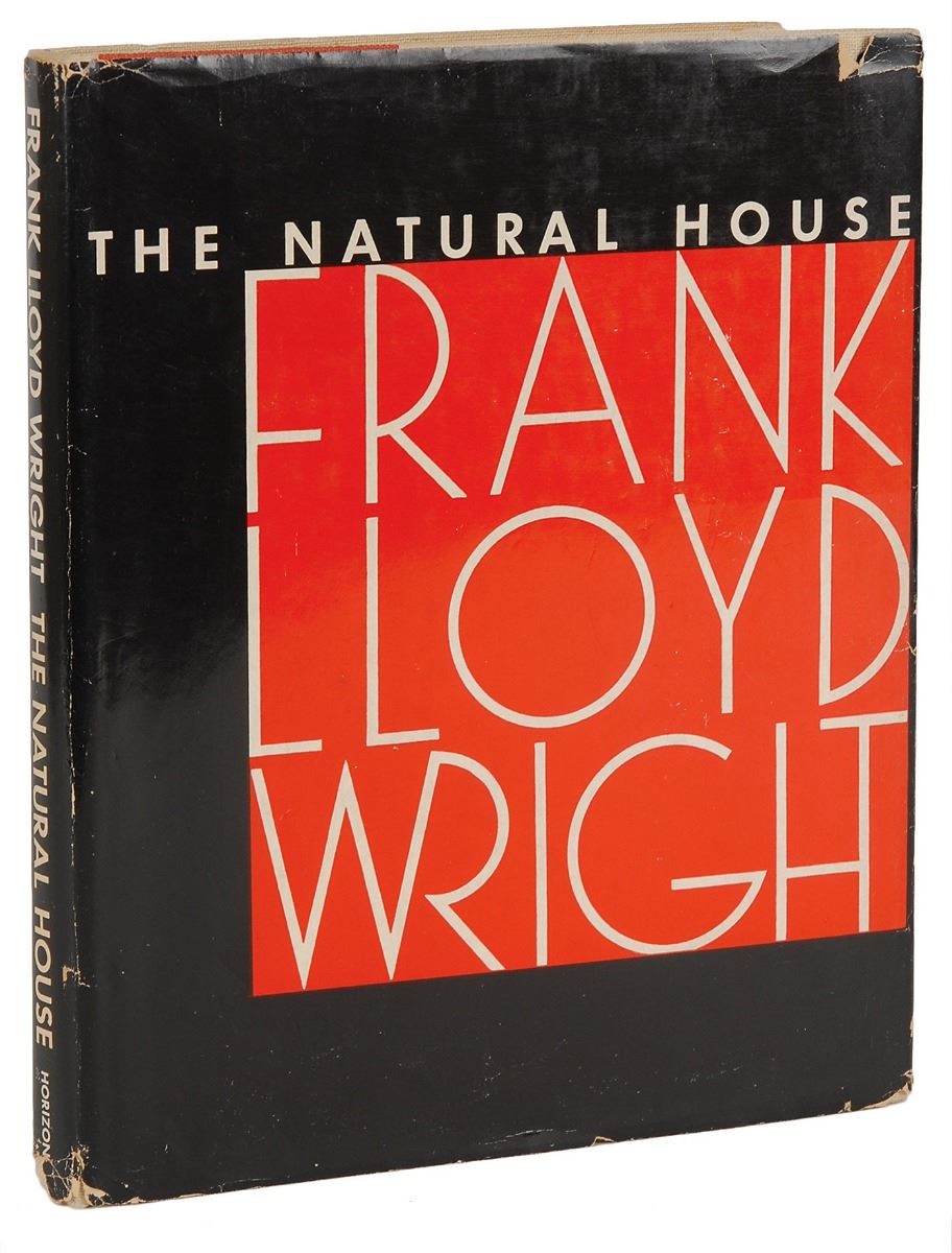 Signed book: The Natural House. First edition. NY: Horizon Press, 1954. Hardcover with dust jacket, 8.25 x 10.25, 223 pages. Signed and inscribed on an opening page in black ink, “Frank Lloyd Wright / 56.” In fine condition.