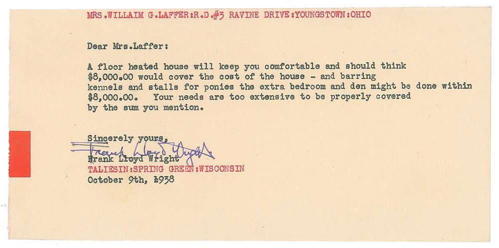TNS, one page, 8 x 3.75, October 9, 1938. Note addressed to Mrs. William G. Laffer, in full: "A floor heated house will keep you comfortable and should think $8,000.00 would cover the cost of the house—and barring kennels and stalls for ponies the extra bedroom and den might be done within $8,000.00. Your needs are too expensive to be properly covered by the sum you mention." In fine condition. William Laffer was the president of the Clevite Corporation, a company that later purchased the Shockley Semiconductor Laboratory in 1960.