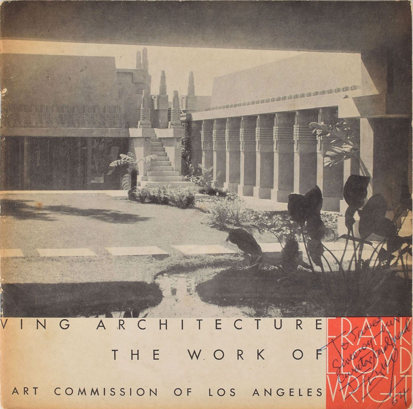 Softcover exhibition catalog entitled "Sixty Years of Living Architecture: The Work of Frank Lloyd Wright," published by the Art Commission of Los Angeles in 1954, 8.5 x 8.5, signed and inscribed on the front cover in ballpoint, "To James Sweeney—our curator and friend, F. Lloyd, 54." In fine condition, with light toning to the covers. Sweeney was the director of the Guggenheim Museum from 1952–1960, and oversaw construction of the iconic Wright-designed museum building. A fantastic association copy of the catalog for the retrospective of Wright's 'organic architecture.'