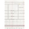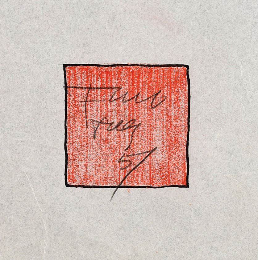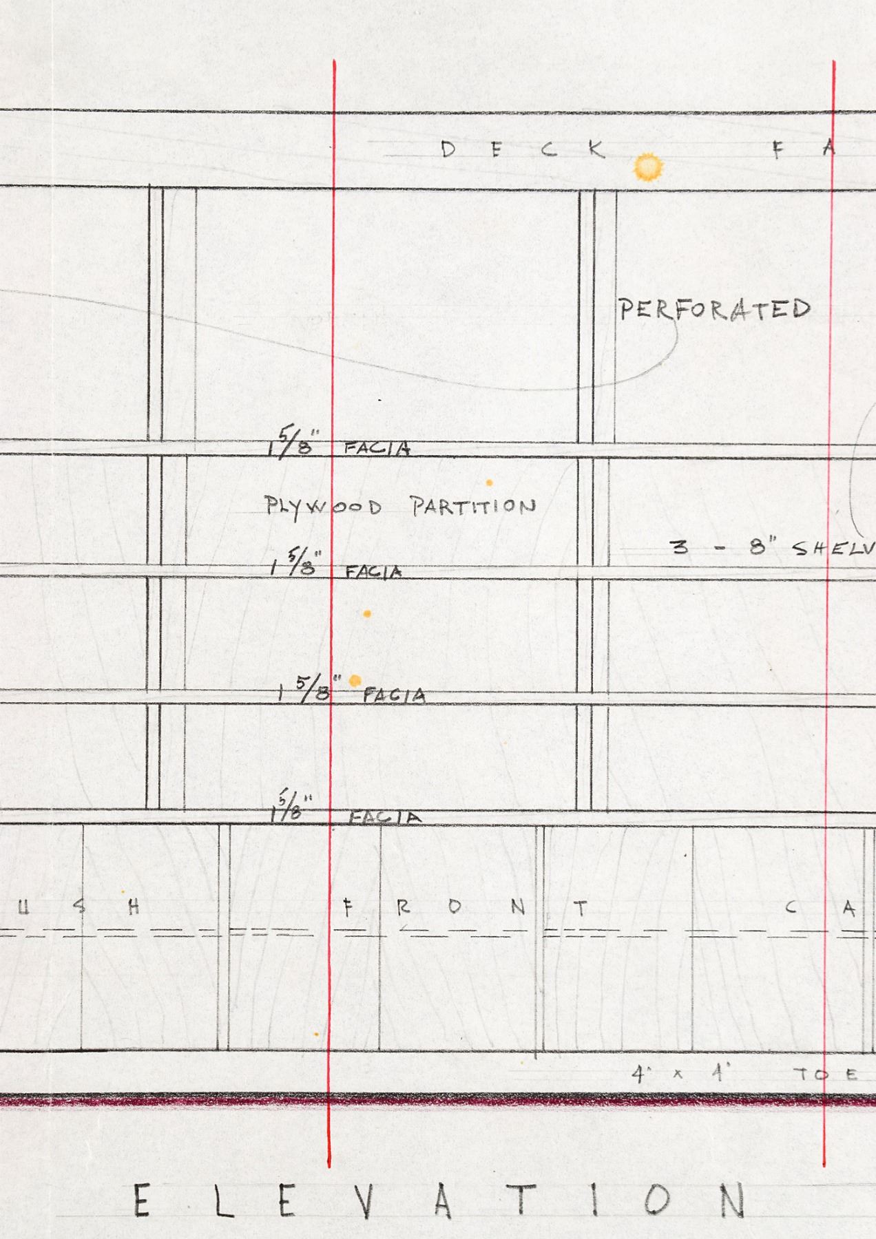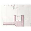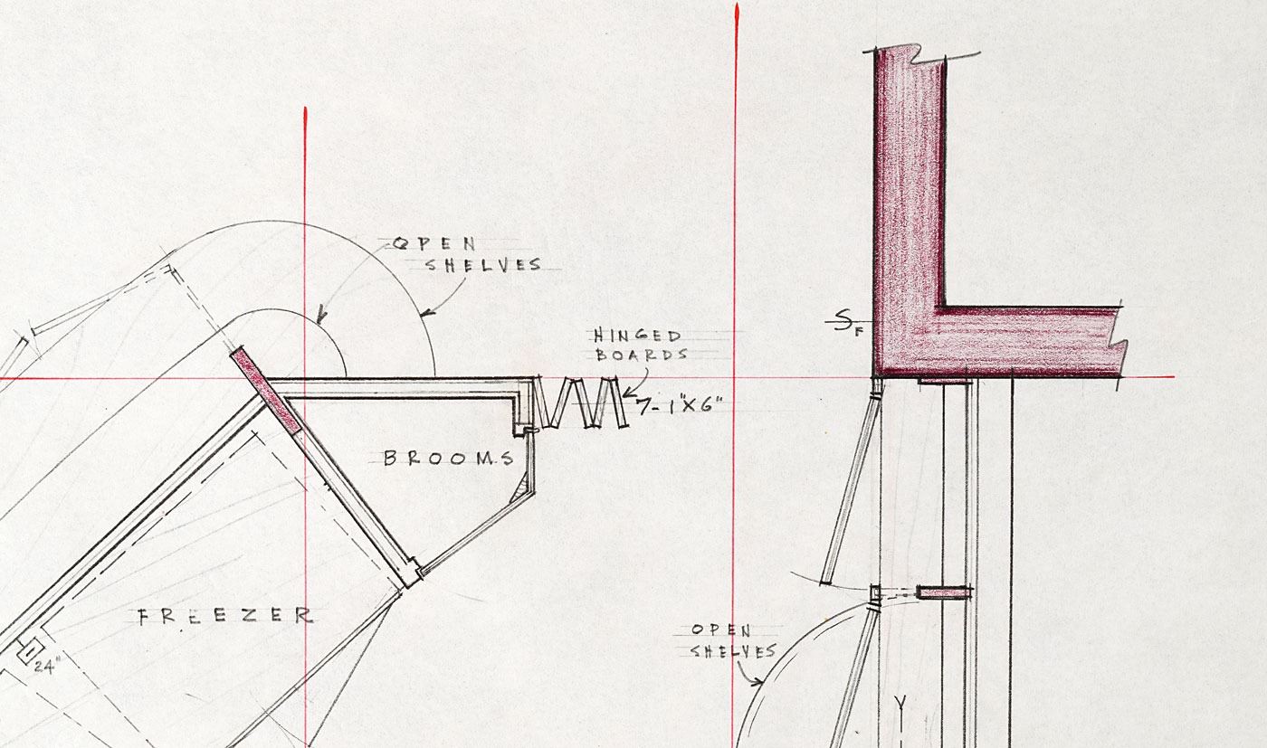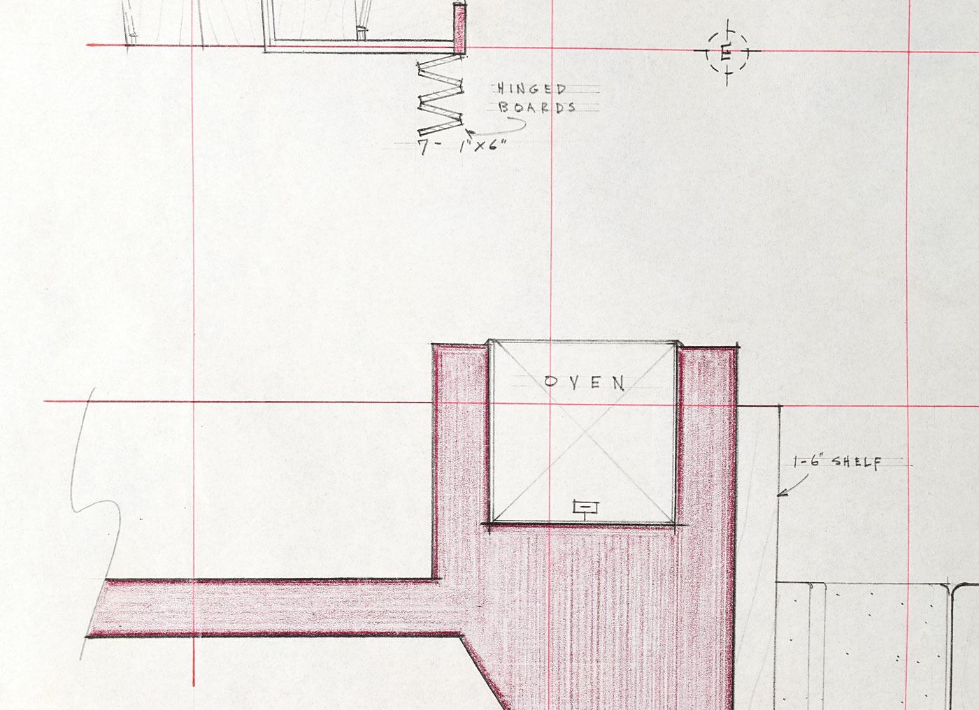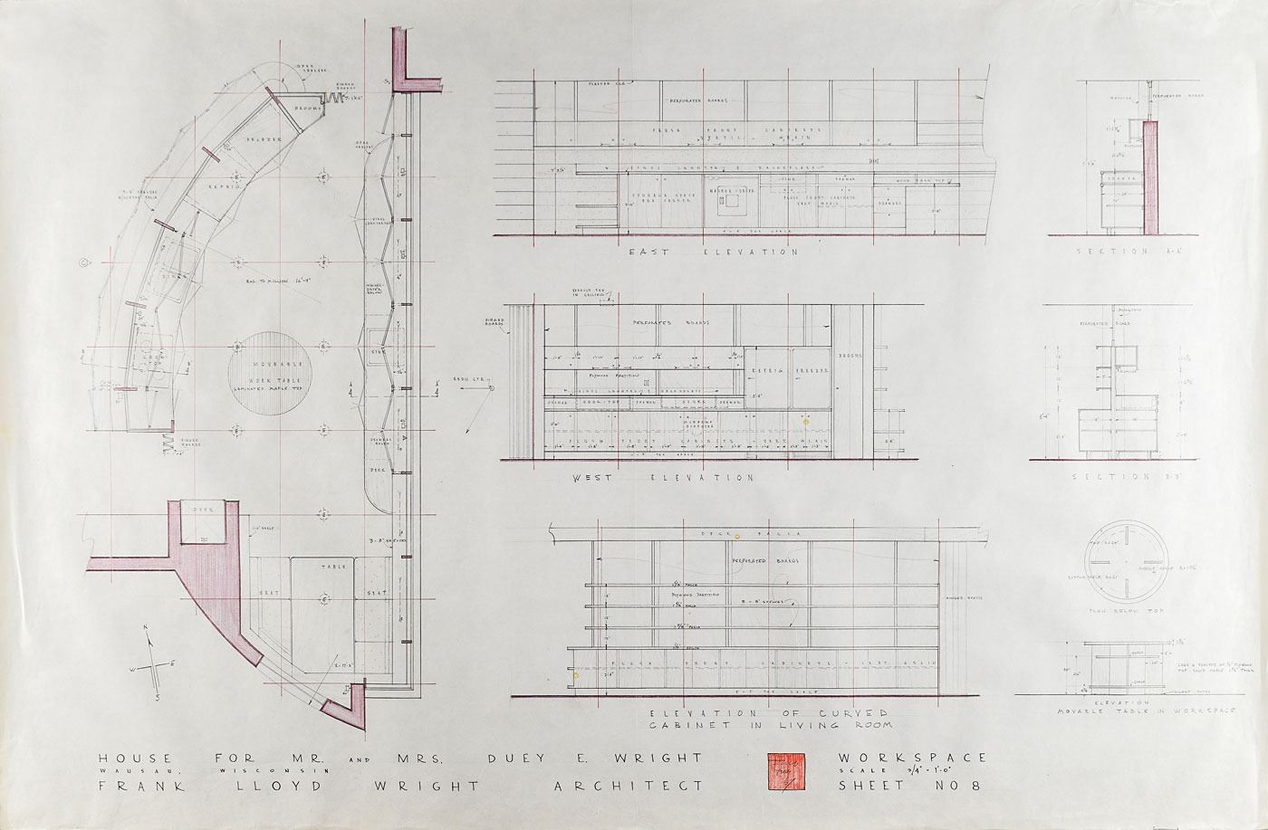 Hand-drawn design of the "Workspace" for "Mr. and Mrs. Duey E. Wright" executed under Wright's oversight at his studio, one page, 45 x 29.5, signed in pencil by Frank Lloyd Wright inside a hand-drawn red 'Taliesen' box at the bottom, "FLLW, Aug 57." The left side of the plan features an overhead view of the kitchen—termed the "workspace" by Wright—which features a functional, open concept design with a moveable work table at center. The middle of the plan shows east and west elevations of the workspace, consisting of appliances, countertops, and cabinets, as well as a view of the curved living room cabinet. On the right side are cross-section views of the workspace cabinetry, and two angles of the moveable work table. The plan is labeled along the bottom: "House for Mr. and Mrs. Duey E. Wright, Wausau, Wisconsin, Frank Lloyd Wright Architect, Workspace, Scale 3/4?-1´-0?, Sheet No. 8." Rolled and in fine condition.