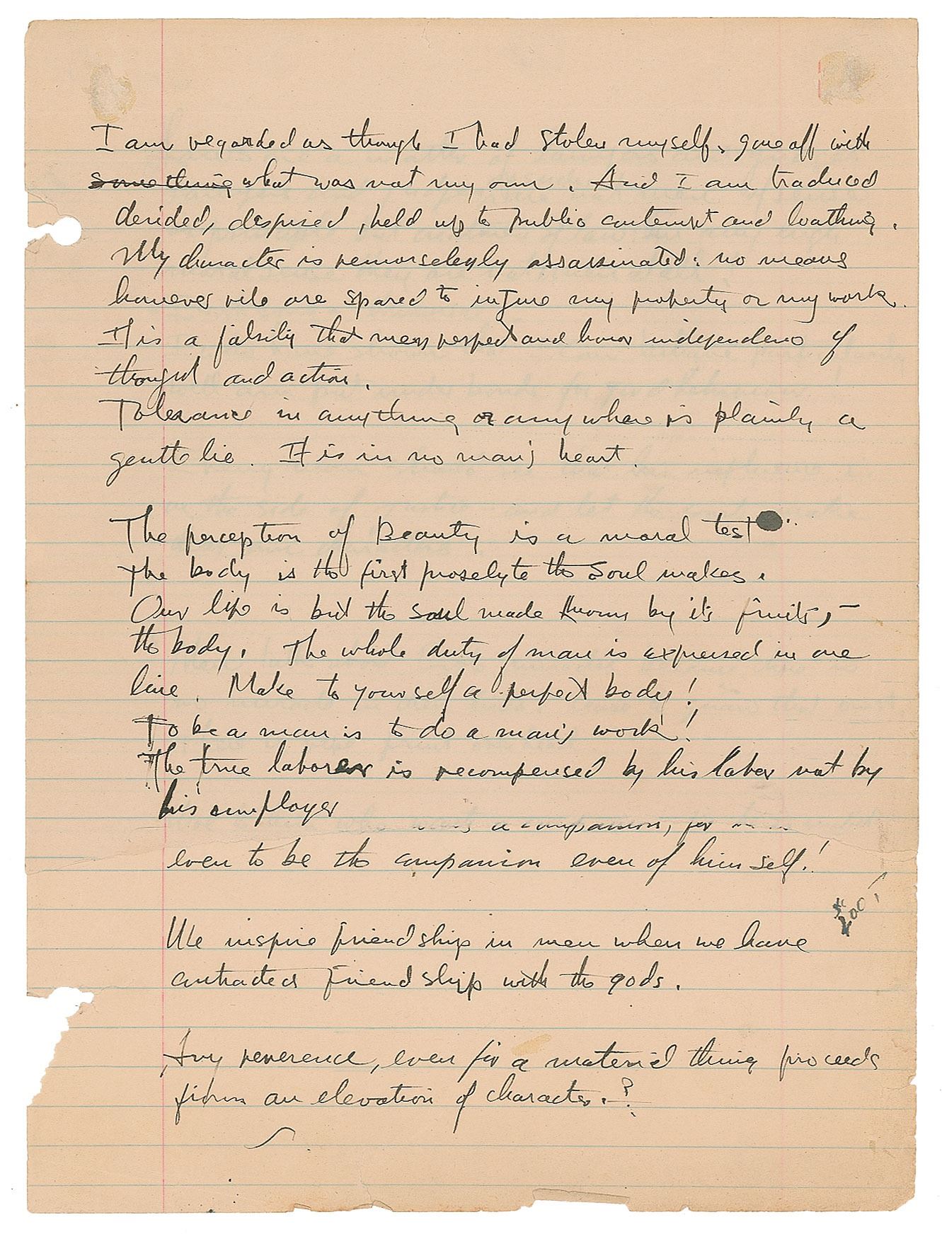 Handwritten manuscript by Frank Lloyd Wright, unsigned, two pages (one measuring 8 x 7.25 and the other 8 x 10.5, affixed together at the top), no date but circa 1926. Ramblings from a man who has loved and lost with the blame firmly placed upon his own shoulders; a vexing manuscript from Wright clearly revealing the effects of his personal upheavals. In part: "I am regarded as though I had stolen myself, gone off with what was not my own. And I am traduced, derided, despised, held up to public contempt and loathing. My character is remorselessly assassinated: no means however vile are spared to injure my property or my work. It is a falsity that men respect and honor independent of thought and action. Tolerance in anything or anywhere is plainly a gentle lie. It is in no man’s heart. The perception of Beauty is a moral test. The body is the first proselyte the soul makes. Our life is but the soul made known by its fruits,—the body. The whole duty of man is expressed in one line. Make to yourself a perfect body! To be a man is to do a man’s work! The true laborer is recompensed by his labor not by his employer. Laws are a matter of lawyers and judges. Lawyers and judges, as such, are not men of sense or principle but creatures of law: In any high moral sense they are not men at all! Earth song. Universal [in pencil]. I who have shown that I can behave particularly well am put under bonds for good behaviour! Every man should see that his influence is on the side of justice—and let the courts make their own characters. Men talk about Bible miracles because there is no miracle in their lives. Cease to gnaw that crust, there is a ripe fruit overhead! Woe to him who wants a companion, for he is unfit even to be the companion even of himself! We inspire friendship in men when we have contracted friendship with the gods. Any reverence, even [if] a material thing proceeds from an elevation of character?" In very good to fine condition, with edge tears and some edge loss, and the bottom of the first page torn off and no longer present.
