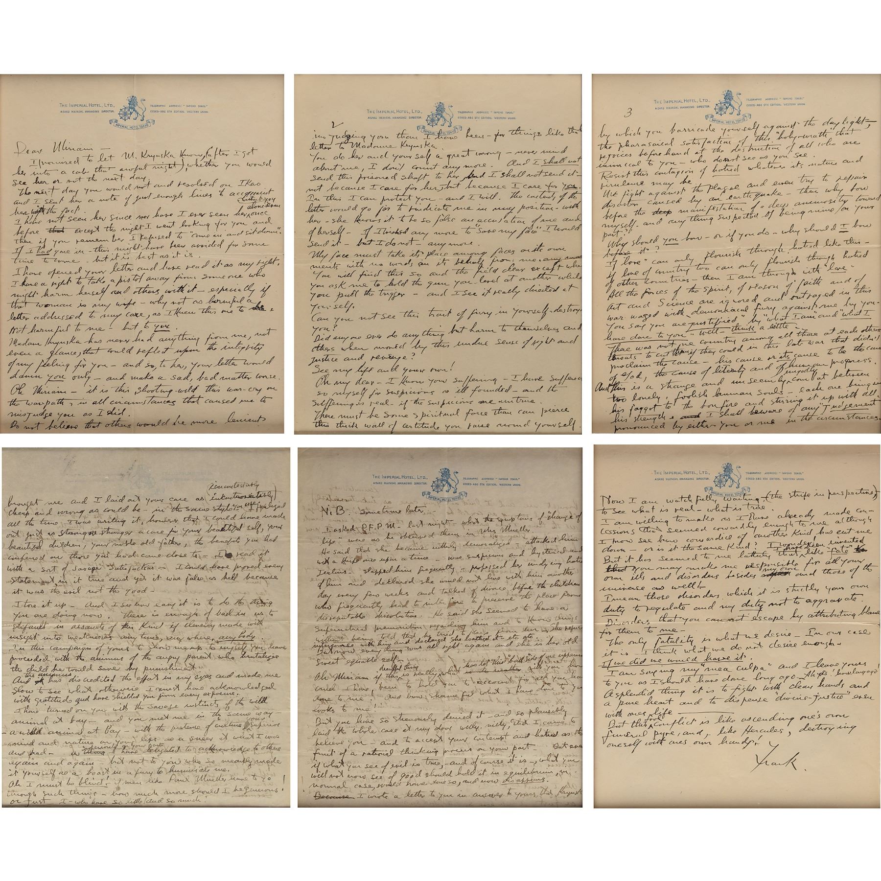 ALS signed “Frank,” six pages on four sheets, 8 x 10, The Imperial Hotel letterhead, no date but circa 1919. Long letter to his wife Miriam, written from his iconic Imperial Hotel in Tokyo, concerning a dramatic episode with one Madam Olga Krynska. In part: "I promised to let M. Krynska know, (after I got her into a cab that awful night), whether you would see her or not the next day…I have not seen her since nor have I ever seen her alone…I have opened your letter and have read it as my right. I have a right to take a pistol away from someone who might harm herself and others with it—especially if that woman is my wife—why not as harmful as a letter addressed to my care, as I knew this one to be. Not harmful to me—but to you. Madam Krynska has never had anything from me, not even a glance, that could reflect upon the integrity of my feeling for you—and so, to her, your letter would damn you only—and make a sad, bad matter worse. Oh Miriam—it is this shooting-wild this war-cry on the warpath, in all circumstances that caused me to misjudge you as I did. Do not believe that others would be more lenient in judging you than I have been—for things like that letter to Madame Krynska.