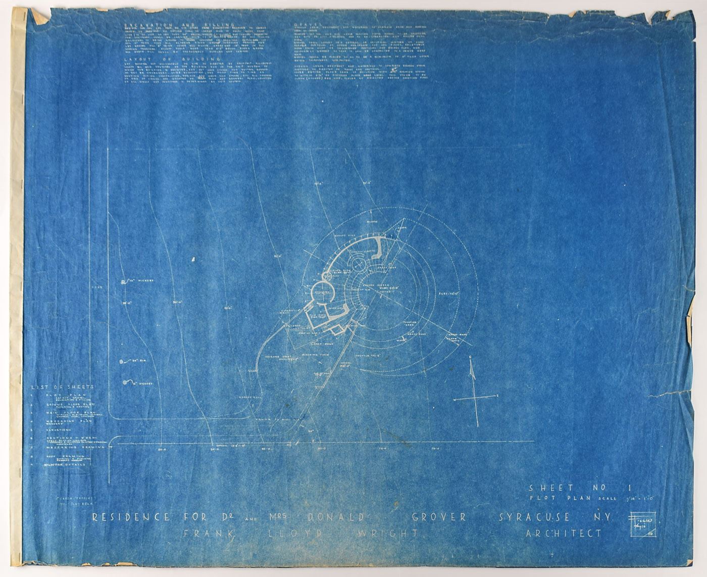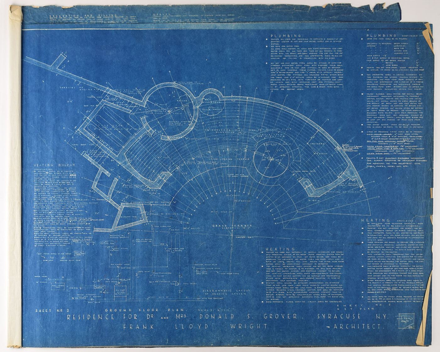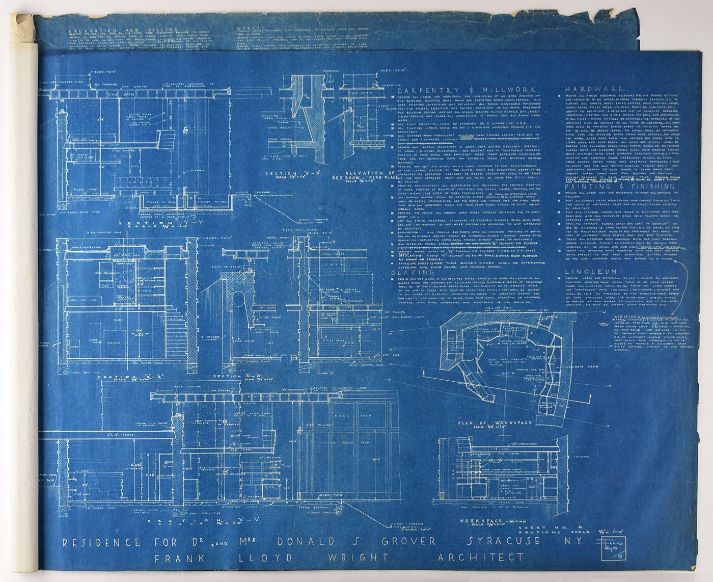 The blueprints are stapled to form a 36.25 x 29.5 booklet containing nine sheets of 1:16 scale plans, each of which are entitled along the bottom, “Residence for Dr. and Mrs. Donald Grover, Syracuse, N.Y., Frank Lloyd Wright, Architect,” with initialed Taliesin box to lower right corner. The sheets are numbered and identified as follows: Sheet No. 1, a plot plan with notes regarding “Excavation and Filling," “Layout of Building,” and “Gravel”; Sheet No. 2, a ground floor plan for “Plumbing” and “Heating Diagram”; Sheet No. 3, a main floor plan related to “Concrete Work” and “Electrical Work”; Sheet No. 4, a mezzanine plan for “Masonry”; Sheet No. 5, a side view concerning “Elevations”; Sheet No. 6, a sections plan relating to “Carpentry & Millwork,” “Hardware,” “Glazing,” “Painting & Finishing,” and “Linoleum”; Sheet No. 7, a mezzanine framing plan; Sheet No. 8, a roof framing plan with notes for “Lathing & Plastering” and “Roofing”; and Sheet No. 9, which consists of “Millwork Details.” Sheets three and four feature handwritten notations.