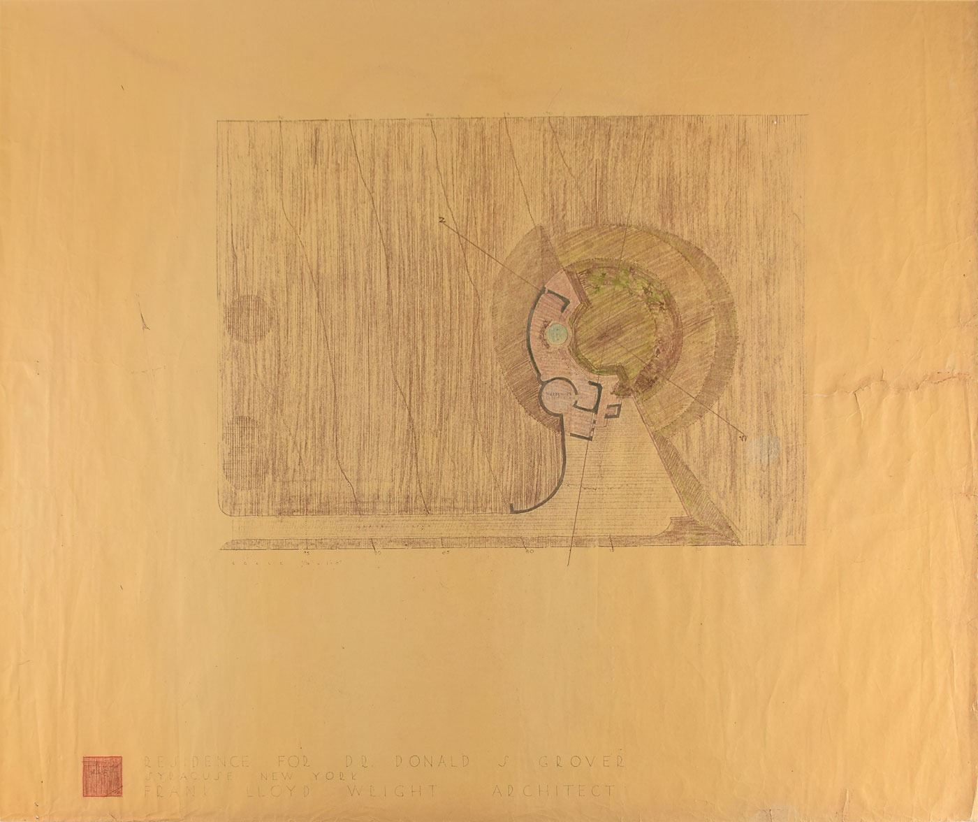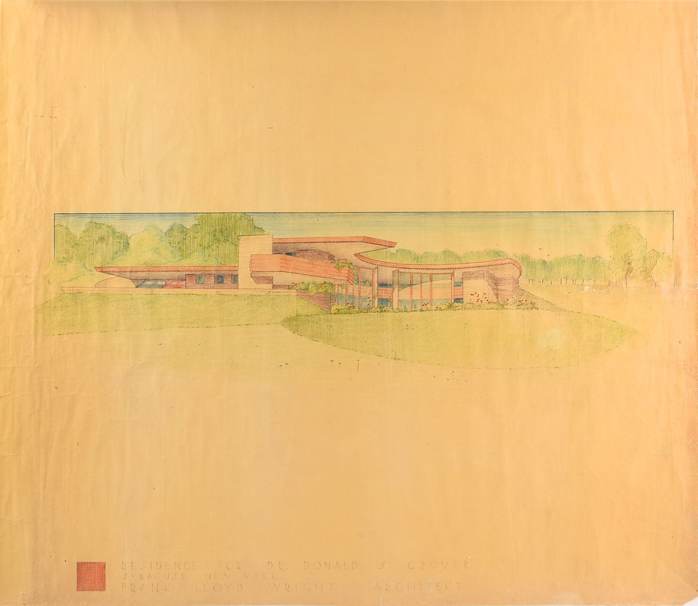 The archive is highlighted a pair of original colored, hand-drawn designs of the proposed Grover estate, expertly accomplished on 37 x 35 sheets of draftsman paper, both of which are entitled along the bottom, “Residence for Dr. Donald S. Grover, Syracuse, New York, Frank Lloyd Wright Architect,” and bear the orange Taliesin block to lower left corner, with one signed and dated, “F. LL. W., Mch 15, 50.” The first is an overview elevation of the first floor, which displays the exterior of the structure and the surrounding grounds, and the second is an 1:16 scale aerial overview of the structure and entire property, which marks the locations of the “Mezzanine,” “Auto Court,” and “Gravel Drive.”