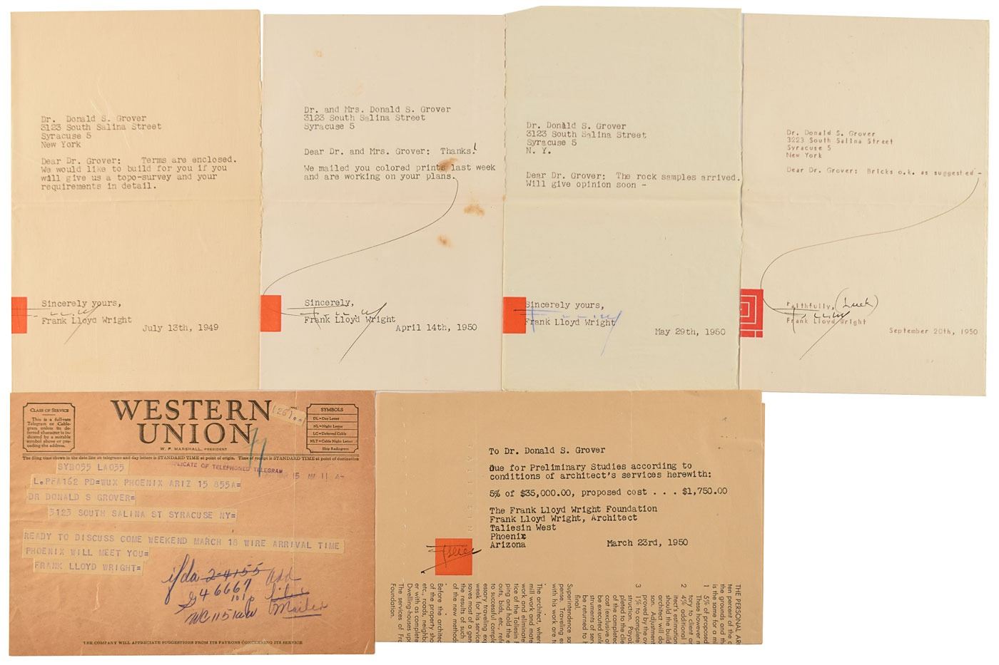 Magnificent archive related to the construction of a residence for Donald and Viola Grover by renowned architect Frank Lloyd Wright, which features two working architectural drawings and a booklet of nine original blueprints for the couple’s planned property in Syracuse, New York. The collection is supplemented by a detailed chain of correspondence between Wright and the Grovers, in addition to letters from Wright’s secretary Eugene Masselink and various building and design companies involved with the project. These letters include four TLSs from Wright, and the original working architect's contract, all of which are signed by Wright with his initials, “F. LL. W.”