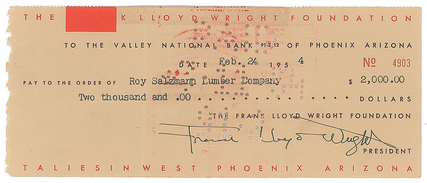 The Frank Lloyd Wright Foundation business check, 8.25 x 3.25, filled out in type and signed by Wright, payable to Roy Salzmann Lumber Company for $2000, February 24, 1954. In fine condition, with light show-through along the top edge from old tape on the reverse.
