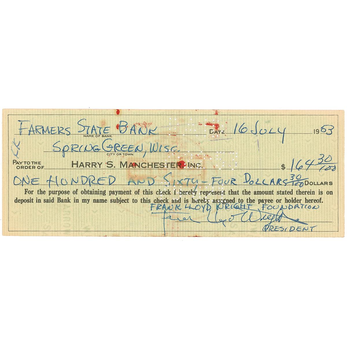 Highly influential American architect (1867–1959) whose mastery of space, form, and human-centered design revolutionized the field of architecture and earned him a place among the greatest thinkers and artists of the 20th century. Bank check, 8 x 3, filled out in another hand and signed by Wright as president of the Frank Lloyd Wright Foundation, payable to Harry S. Manchester Inc. for $164.30, July 16, 1953. Show-through from stamps on reverse and cancellation holes to body, otherwise fine condition.