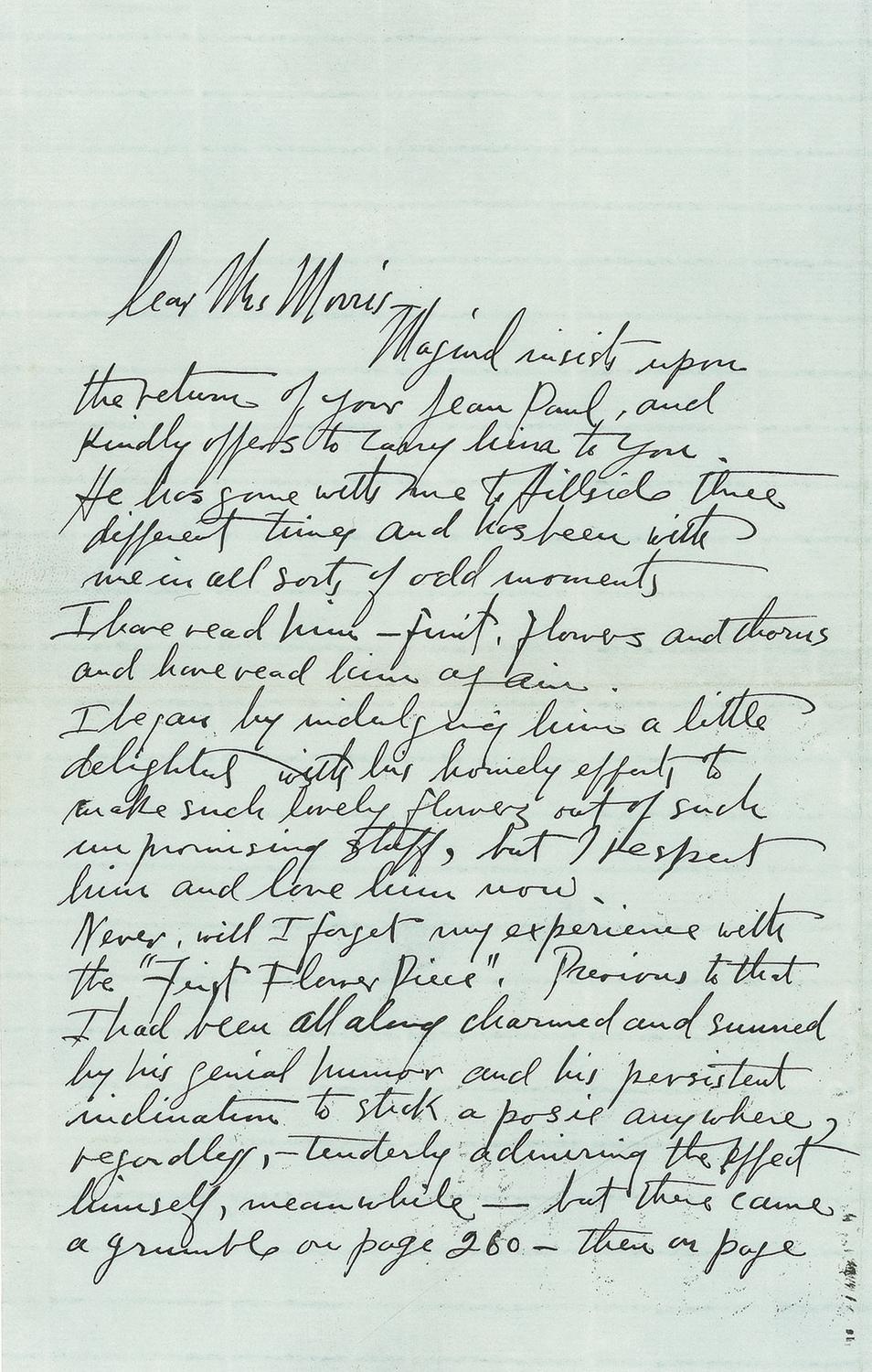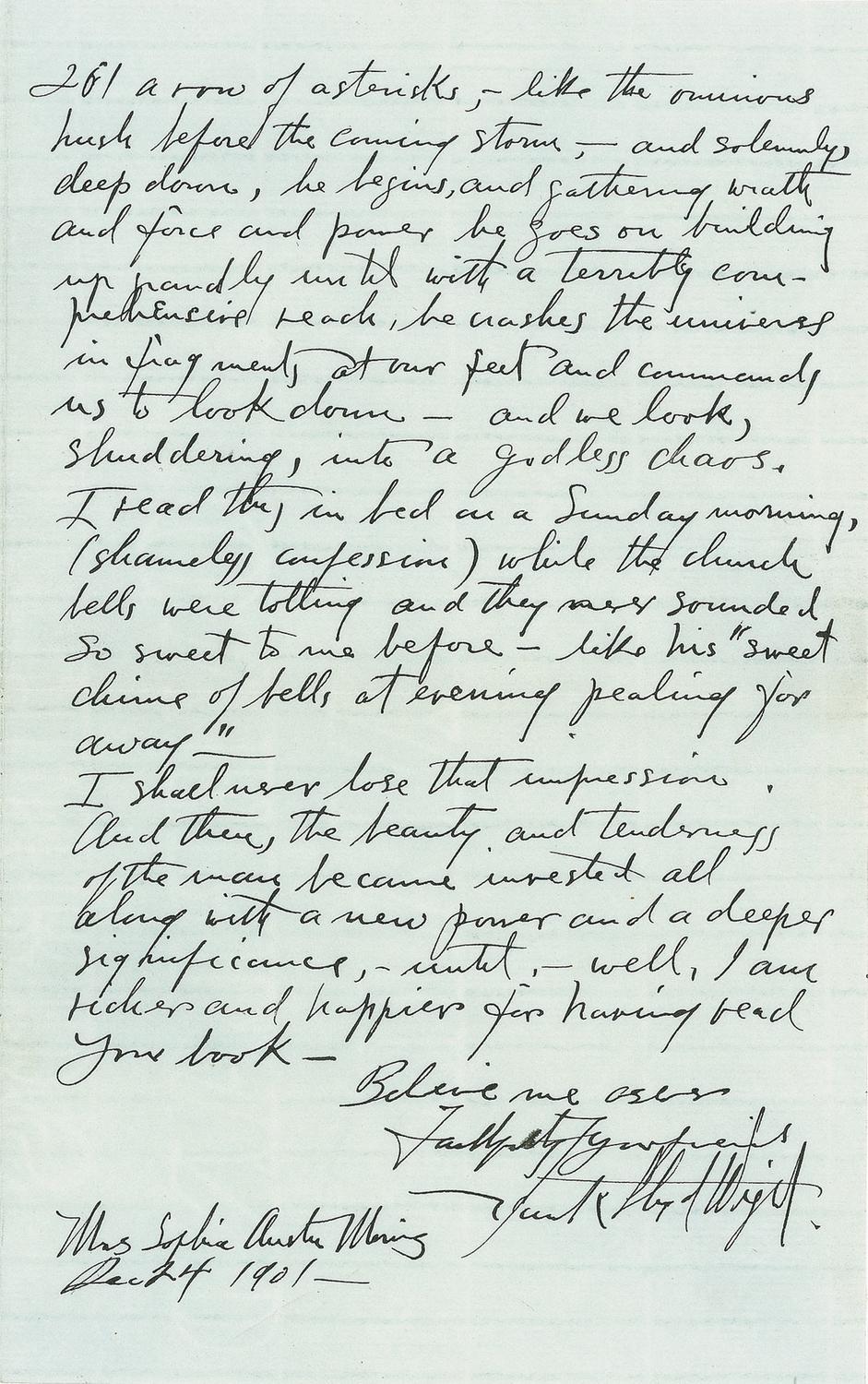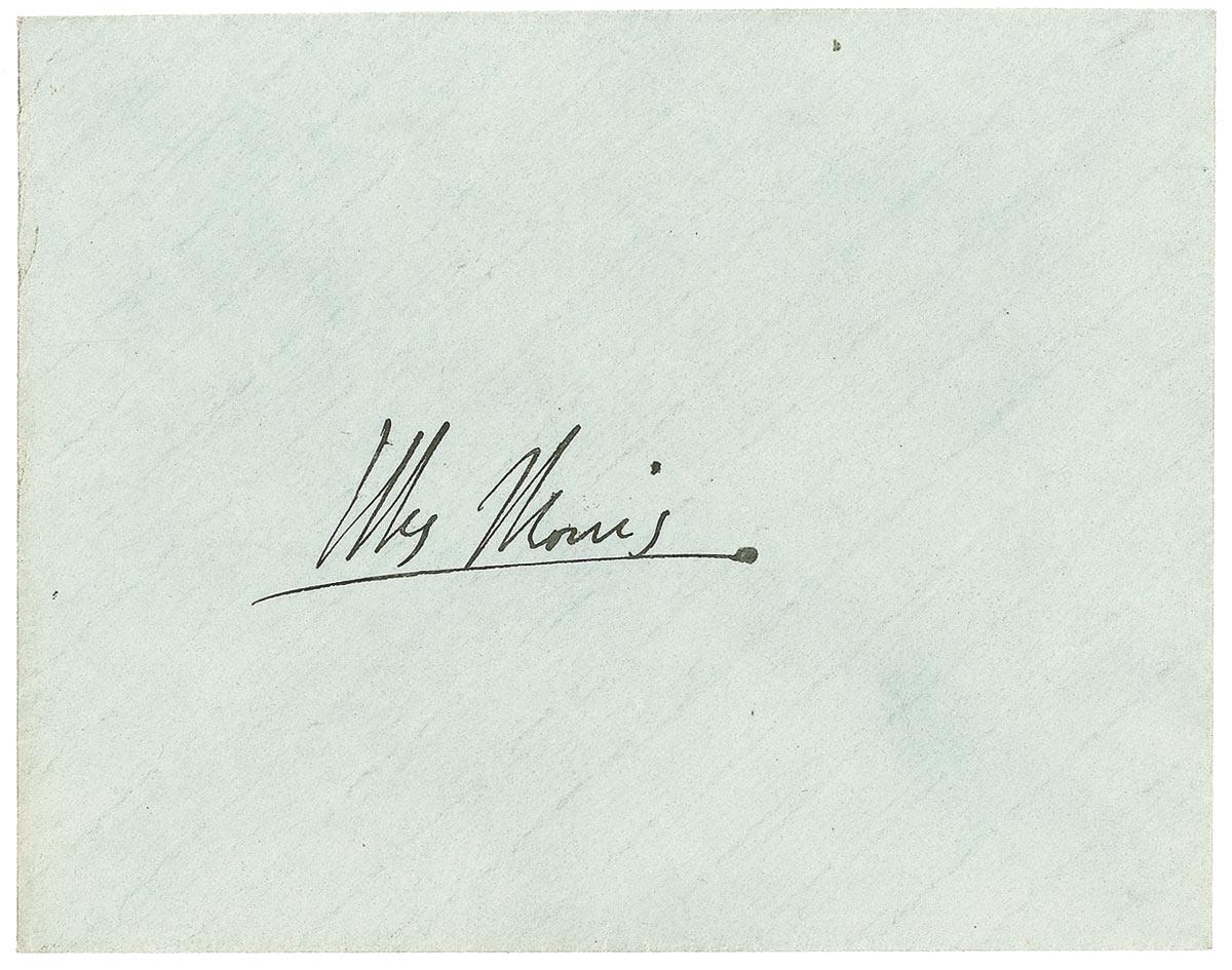 Highly influential American architect (1867–1959) whose mastery of space, form, and human-centered design revolutionized the field of architecture and earned him a place among the greatest thinkers and artists of the 20th century. Rare, early ALS, two pages, 5 x 8, December 24, 1901. Letter to Mrs. Sophia Morris. In full: “Majind insists upon the return of your Jean Paul, and kindly offers to carry him to you. He has gone with me to Hillside three different times and has been with me in all sorts of odd moments. I have read him—fruit, flowers and thorns and have read him of air.