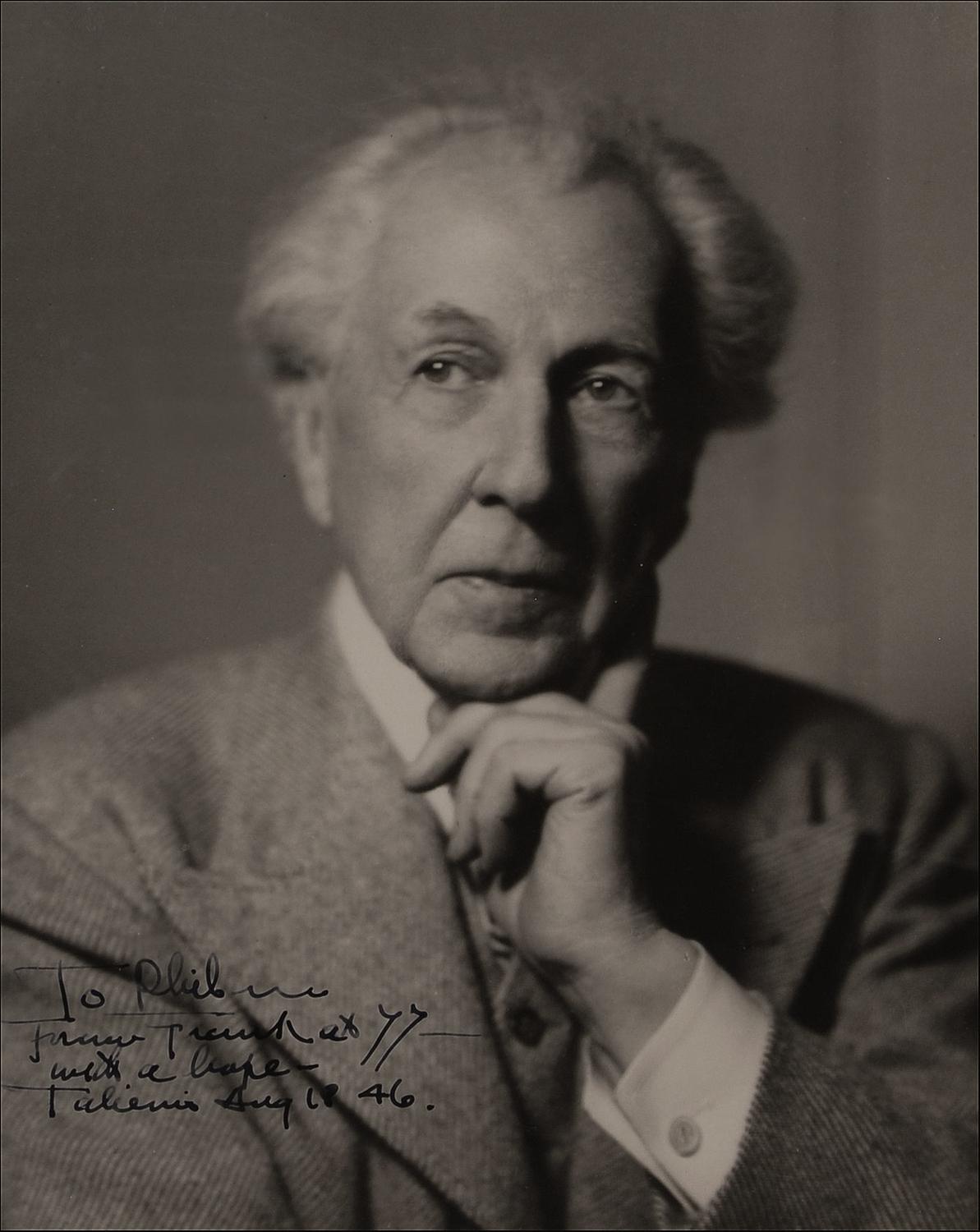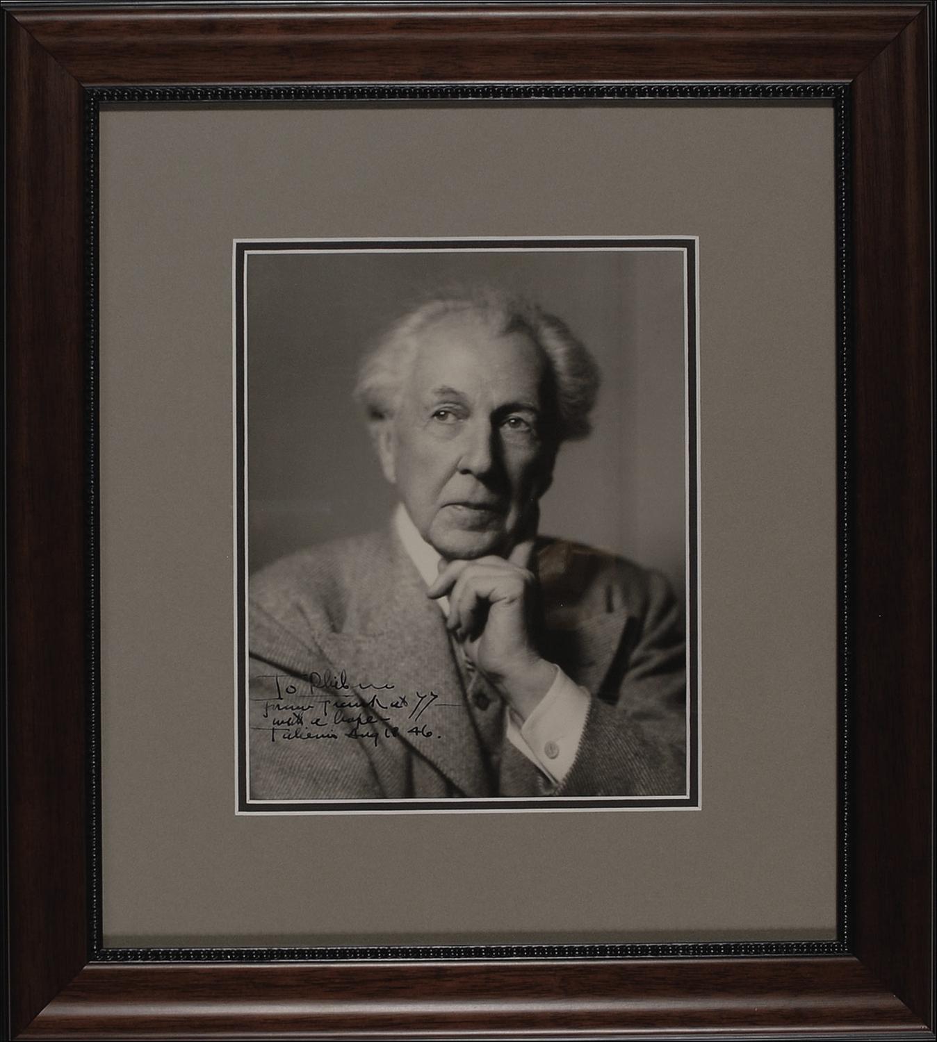 Highly influential American architect (1867–1959) whose mastery of space, form, and human-centered design revolutionized the field of architecture and earned him a place among the greatest thinkers and artists of the 20th century. Magnificent vintage pearl-finish 7.5 x 9.5 photo of Wright in thought, signed and inscribed in fountain pen, “To Phil—From Frank at 77—with a hope, Taliesin, Aug. 18 46.” Double matted and framed to an overall size of 16 x 18. In fine condition, with the matting covering a trimmed top edge.