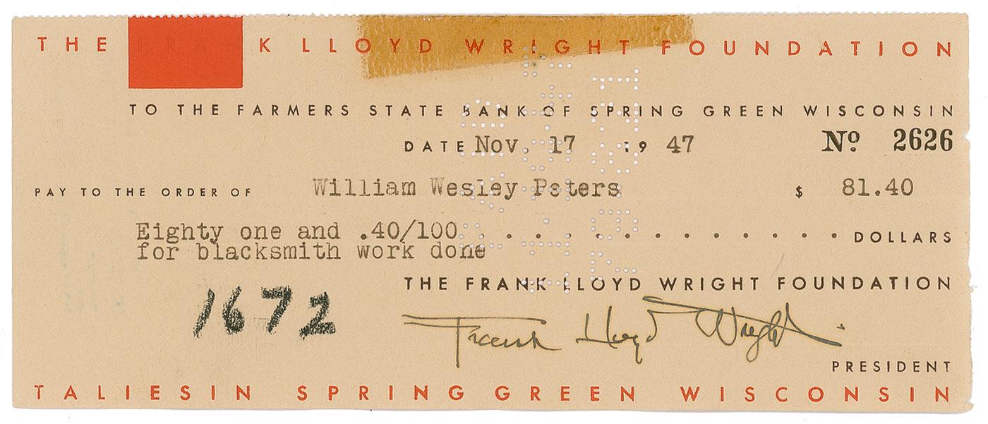 Wright-designed business check for the Frank Lloyd Wright Foundation, 8.25 x 3.5, filled out in type and signed by Wright, payable to William Wesley Peters for $81.40, November 17, 1947. An old tape remnant along top edge, expected cancellation holes, not affecting signature, a rough right edge, and crayon notation to lower left, otherwise fine condition.