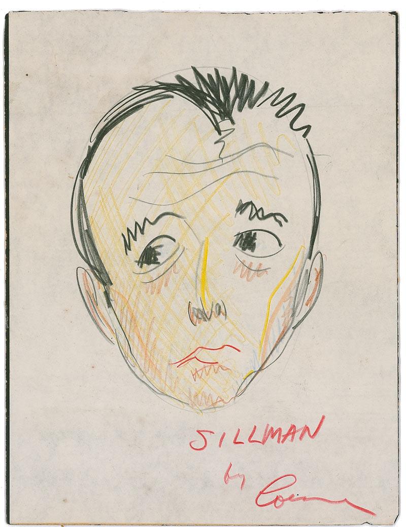 Academy and Tony Award-winning composer(1910-1969). Original signed colored-pencil sketch portrait of Broadway producer Leonard Sillman on an 8 x 10.25 off-white sheet affixed to an identical size heavy stock card, signed at the bottom, “Sillman by Loesser.” In fine condition, with a bit of scattered trivial toning and foxing.