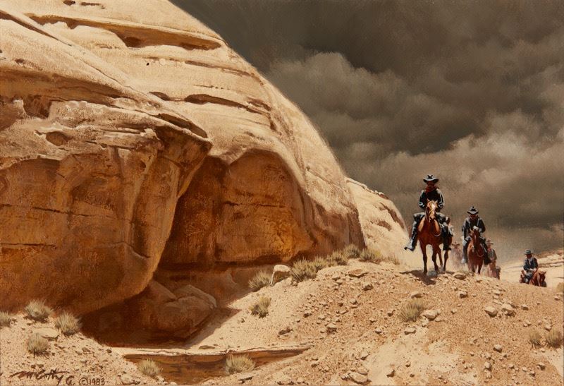 To the unaided eye, this piece appears to be in very good condition. Inspection under ultraviolet light reveals a normal fluorescence of the artist's pigments. There are no signs of damage or restoration. The piece is framed in a rustic wooden frame with a gold leafed inner rim and a linen liner. The frame is also in very good condition. Verso: [handwritten on back of panel] #663 "Desert Patrol" all rights reserved © 1983 [artist's signature]; [sticker attached to back of frame] Husberg Fine Arts Gallery, Sedona, AZ