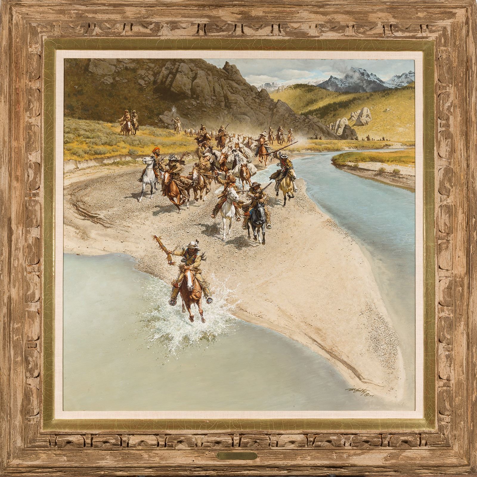 Condition details: This painting is in very good condition. Close inspection with both the unneeded eye and under UV light reveals normal florescence of artist pigments and no signs of any restoration. The work is framed in a carved gray rustic frame of the gold leaf inner edge and a linen liner. The frame is in very good condition with little wear. Verso: Inscribed in artist's hand: # 237 “Thar’s Rendezvous” All reproduction rights held by the artist - Frank McCarthy. Label: The R. W. Norton Art Gallery, Shreveport Louisiana. Frank McCarthy retrospective April 22 to June 5, 1977. Label: Thomas Gilcrease Institute of American History and art. Gilcrease Rendezvous 1984.