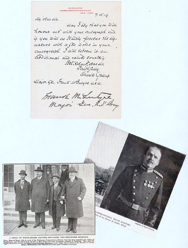 FRANK McINTYRE American World War I General. A signature “Frank McIntyre Major Gen. U.S. Army” at the conclusion of an autograph request. It is in fine condition and attached to a larger sheet with photographs of the distinguished general