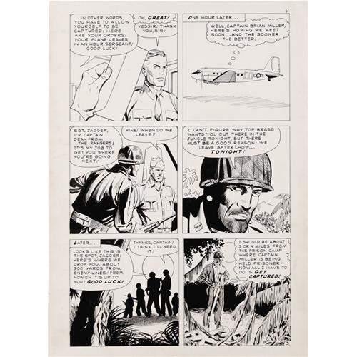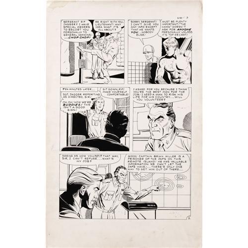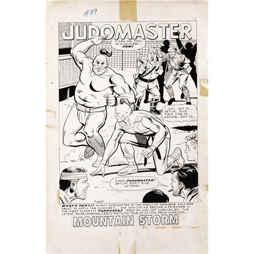 <B>Frank McLaughlin - Judomaster #89 Complete 20-page Story "Prisoner of War" Original Art (Charlton, 1966).</B></I> Judomaster must battle the deadly Mountain Storm before he can free a camp of Prisoners of War in this all-out slugfest, drawn by martial arts master Frank McLaughlin. Judomaster was in tune with the whole martial arts craze of the late sixties. The image area of each thrilling page measures 12" x 18", and aside from a few tape stains on the borders of a few pages, the pages average Very Good condition.