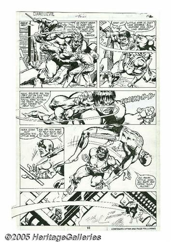 <B>Frank Miller and Joe Rubinstein - Daredevil #163, page 19 Original Art (Marvel, 1979).</B></I> Daredevil tries to help Bruce Banner out and gets himself badly beaten by the Hulk for his trouble, in this page from <B>Daredevil</B></I> #163. The Emerald Juggernaut sends Horn-head flying with a flick of the wrist, in this break-neck bonanza by penciler Frank Miller and inker Joe Rubinstein. Created during Frank Miller's long and glorious reign on this seminal feature, this tense page features two of Marvel's mainstays in hand-to-hand combat! The image area measures 10" x 15" and aside from some light soiling along the right edge, and the upper edge and corner trimmed during the printing process (outside of the image area), the art is in Excellent condition. Signed by Frank Miller and Joe Rubinstein in the final panel.