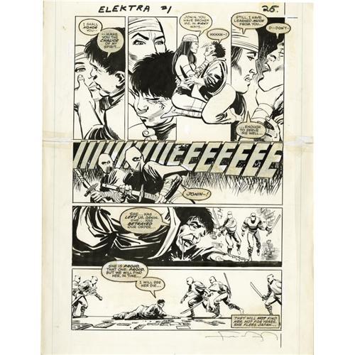<B>Frank Miller and Klaus Janson - Elektra Saga #1, page 25 Original Art (Marvel, 1984).</B></I> Here's your chance to own a page featuring one of Frank Miller's greatest creations, the assassin, Elektra. Elektra puts her own special kind of hurt on the Hand's Jonin, and makes good her escape in this riveting scene from the <B>Elektra Saga</B></I> #1. The image area of this page measures 10" x 15", and Frank Miller has signed it at the lower right. The page was cut between panel tiers one and two, and re-joined with tape on the back of the page. Several of the pasted-on word balloons have yellowed, and two lost balloons have been carefully replaced ("I shall honor..." in panel one, and "Jonin, you have..." in panel three); otherwise, the art is in Very Good condition. A copy of the published comic is included with this lot.
