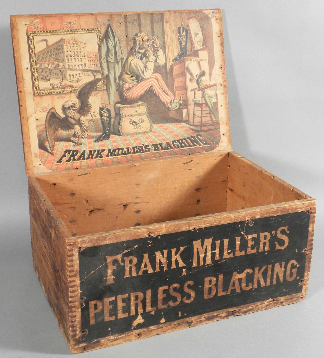 Frank Miller's Peerless Blacking Wood Crate. Original paper label on interior and front. Outstanding graphic showing "Uncle Sam" shaving using his boot as a mirror, while the "Eagle" attacks his reflection in the other boot. Image of factory hands in the back ground. Minor paper loss to front label otherwise good condition. 11 3/4 X 5 1/2 X 8 Start Pirceinches closed. Start Price $100