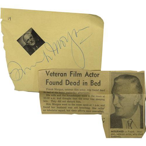 <B>Frank Morgan Autograph.</B></I> Autograph album page signed by the "Wizard of Oz" actor in blue ink, in Excellent condition with a newspaper clipping about Morgan's death glued to the page and tearing along one side that does not affect the signature. <I>With COA from PSA/DNA.</B></I> <BR><BR><B>Important no