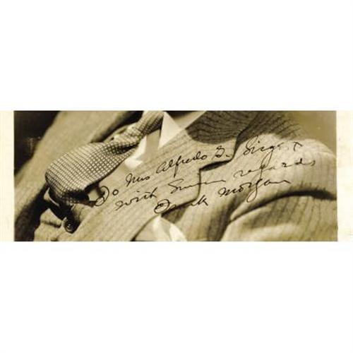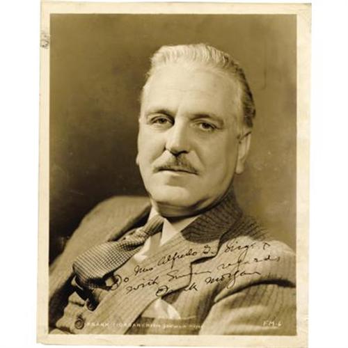 <B>Frank Morgan Signed Photo.</B></I> A b&w 8" x10" publicity still of actor Frank Morgan (the titular <I>Wizard of Oz</B></I>), inscribed and signed by him in black fountain ink. In Fine condition with moderate toning and mild to moderate soiling and wear along the edges. <I>Accompanied by LOA from PSA/DNA.</B></I><BR><BR><b>Shipping:</b> Flat Material, Small (<a target="_blank" href="http://www.heritageauctions.com/common/shipping.php">view shipping information</a>)