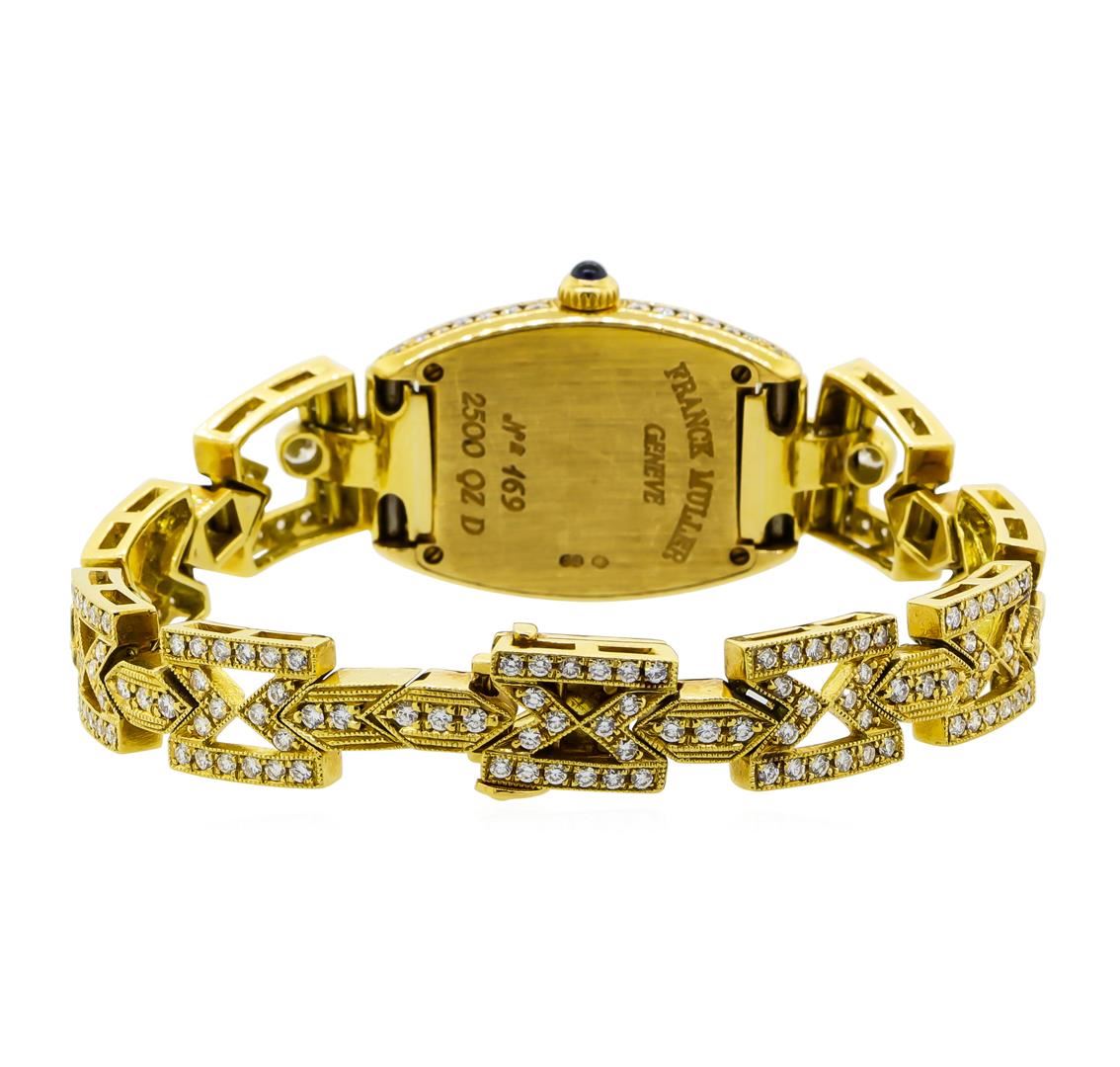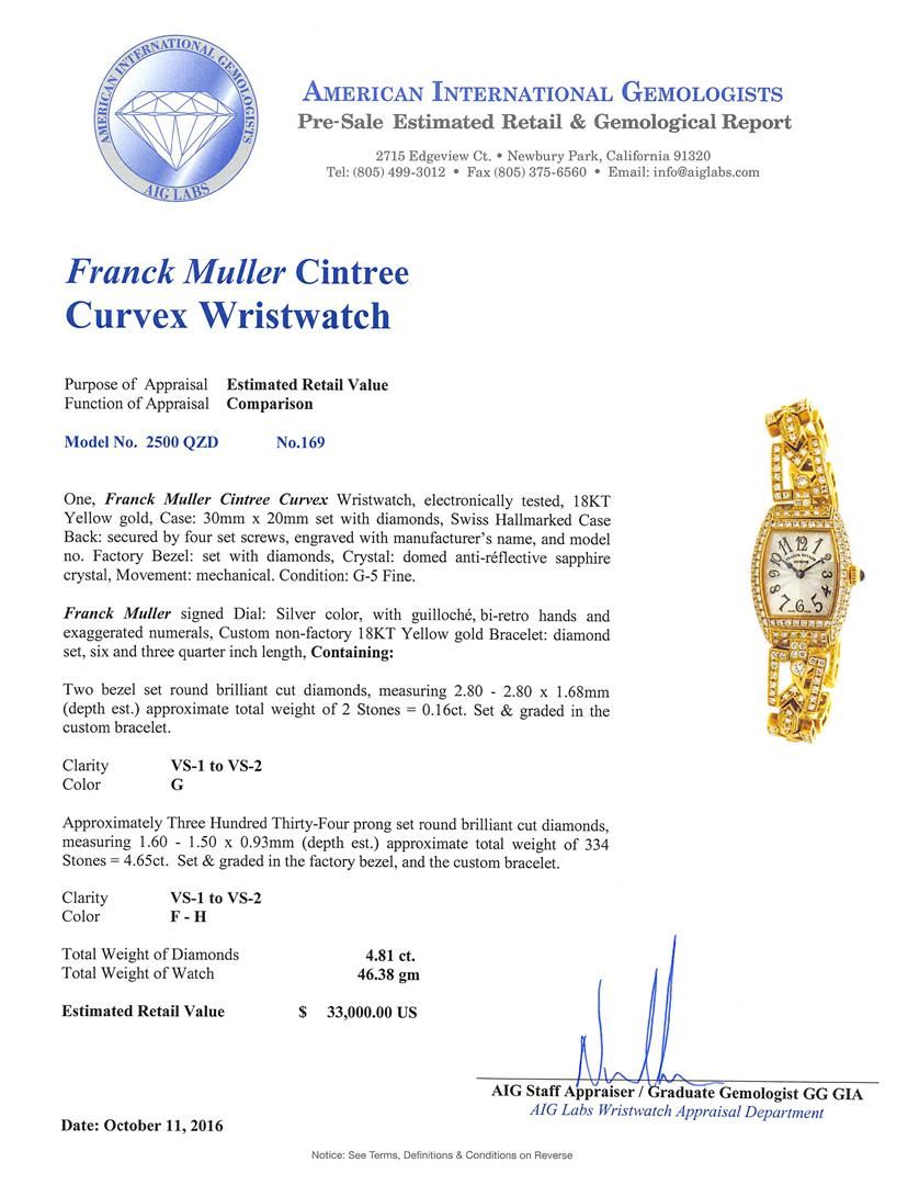 One, Franck Muller Cintree Curvex Wristwatch, electronically tested, 18KT Yellow gold, Case: 30mm x 20mm set with diamonds, Swiss Hallmarked Case Back: secured by four set screws, engraved with manufacturer's name, and model no. Factory Bezel: set with diamonds, Crystal: domed anti-reflective sapphire crystal, Movement: mechanical. Condition: G-5 Fine. Franck Muller signed Dial: Silver color, with guilloche, bi-retro hands and exaggerated numerals, Custom non-factory 18KT Yellow gold Bracelet: diamond set, six and three quarter inch length, Containing: Two bezel set round brilliant cut diamonds, measuring 2.80 - 2.80 x 1.68mm (depth est.) approximate total weight of 2 Stones = 0.16ct. Set & graded in the custom bracelet. Clarity: VS-1 to VS-2 Color G Approximately Three Hundred Thirty-Four prong set round brilliant cut diamonds, measuring 1.60 - 1.50 x 0.93mm (depth est.) approximate total weight of 334 Stones = 4.65ct. Set & graded in the factory bezel, and the custom bracelet. Clarity: VS-1 to VS-2 Color F - H. Total Weight of Diamonds 4.81ct. Total Weight of Watch 46.38gm. AIG Appraised at $33,000.00.