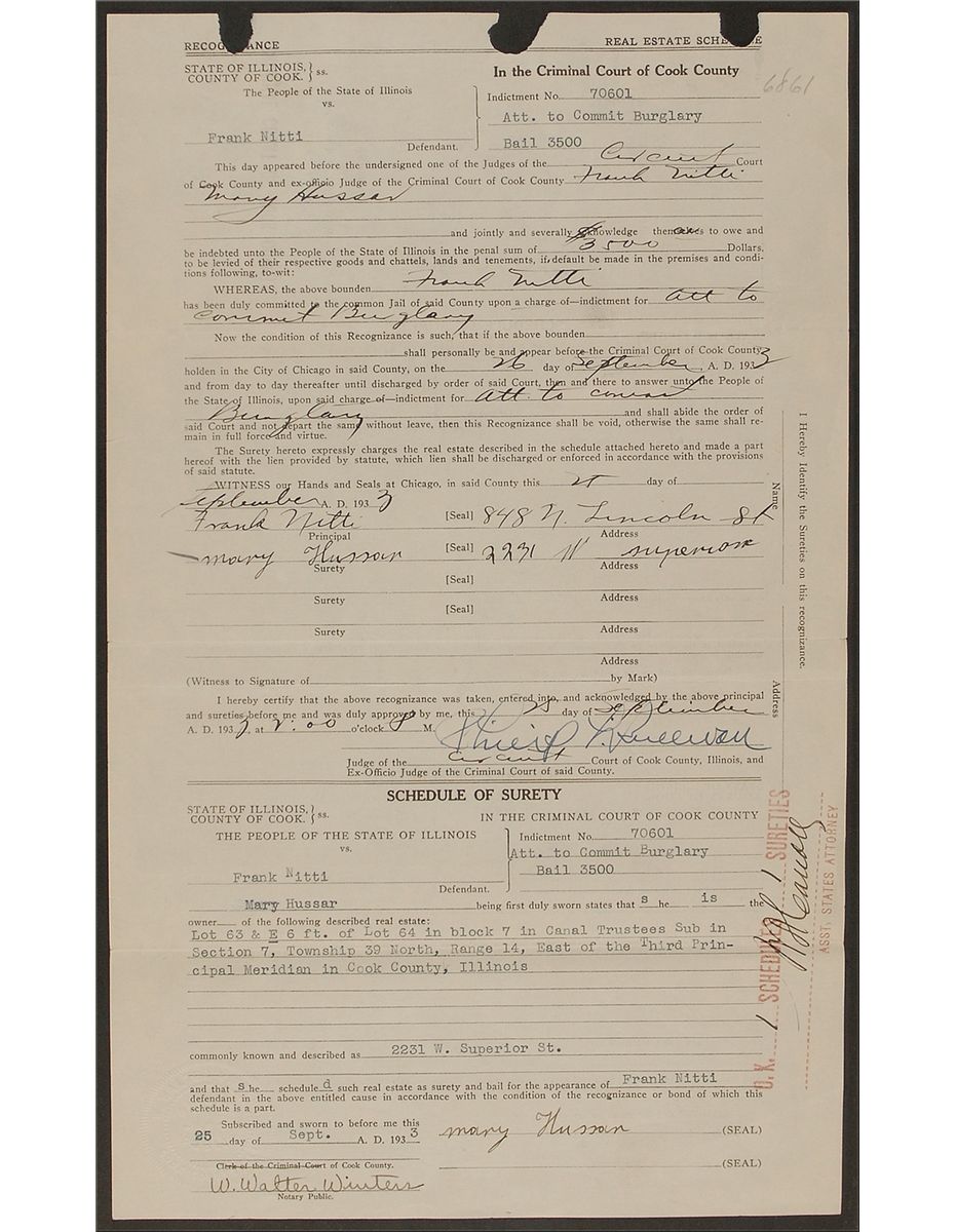 One of Al Capone’s top henchmen (1886–1943) who was in charge of all of the ‘muscle’ operations. He later became the frontman for the Chicago Outfit. Very rare DS, one page, 8.5 x 14, September 25, 1933. A Real Estate Schedule of Security offered as bail for Nitti by Mary Hussain. Hussain puts up a parcel of land valued at $3500 with Nitti being held on a charge of “Att. to commit Burglary.” Signed in the middle of the document, as the principal, “Frank Nitti,” adding his Lincoln Street address, and also signed by Hussain. Double matted and framed to an overall size of 14 x 19.75. Horizontal folds, three torn punch holes to top edge, a couple small stamps and notations, and a few creases, otherwise fine condition. A great document relating directly to Nitti’s life of crime.