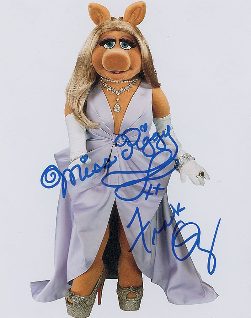 Color satin-finish 8 x 10 photo of the most glamorous of the Muppets, signed in blue felt tip, “Miss Piggy xx, Frank Oz.” In very fine condition.