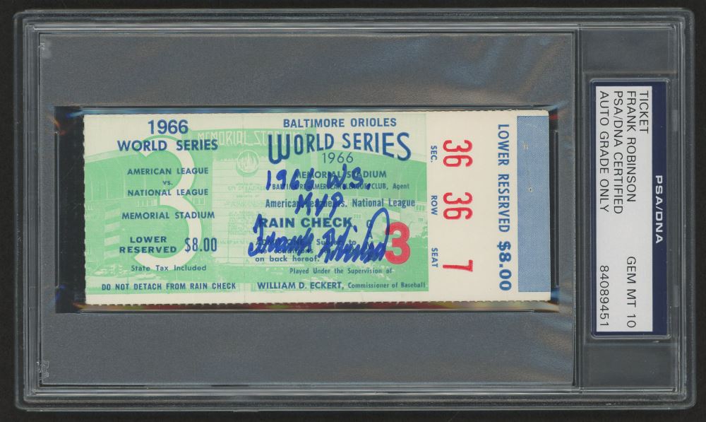 1966 World Series ticket has been hand-signed and inscribed in blue felt-tip pen by Frank Robinson (Orioles, HOF). The autograph has been graded PSA 10.