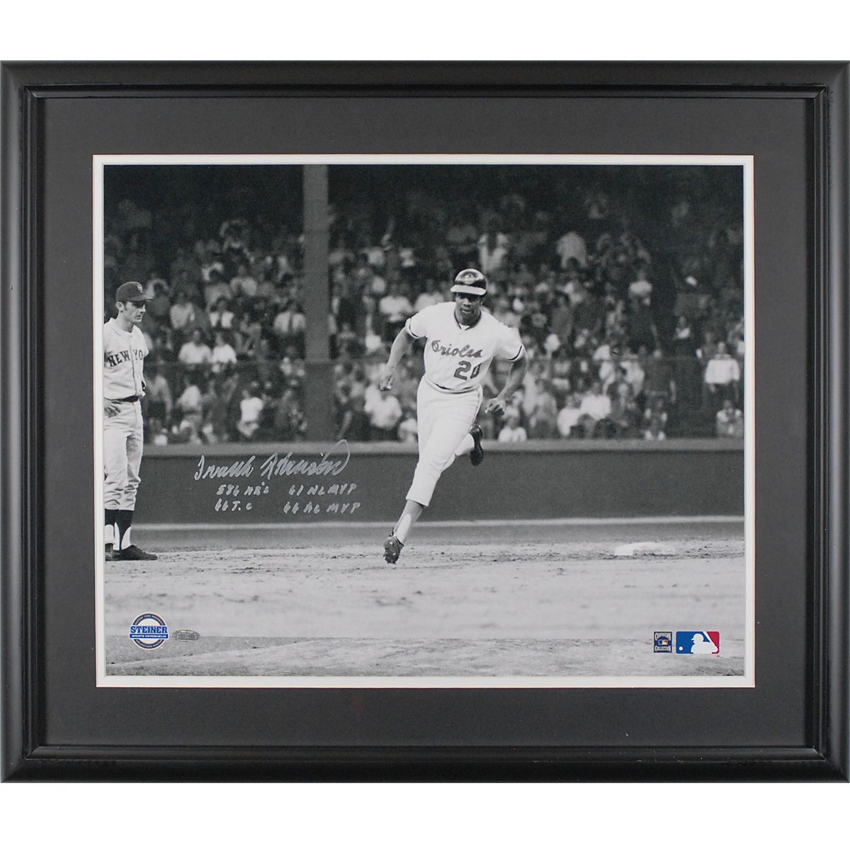 Glossy 19.5 x 15.5 photo of Robinson rounding the bases against the Yankees, signed in silver ink, with Robinson adding several of his career accomplishments underneath. Double-matted and framed to an overall size of 26 x 22. In fine condition. Accompanied by a certificate of authenticity from Steiner. Oversized.