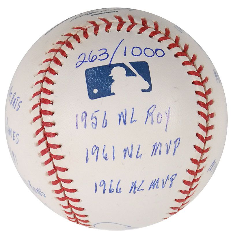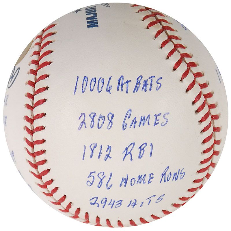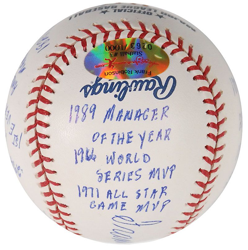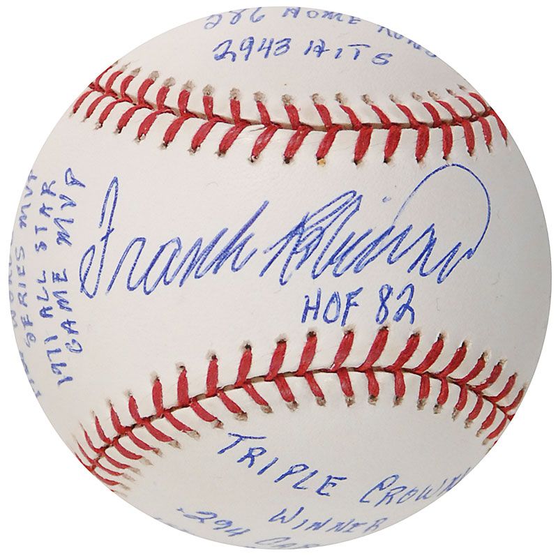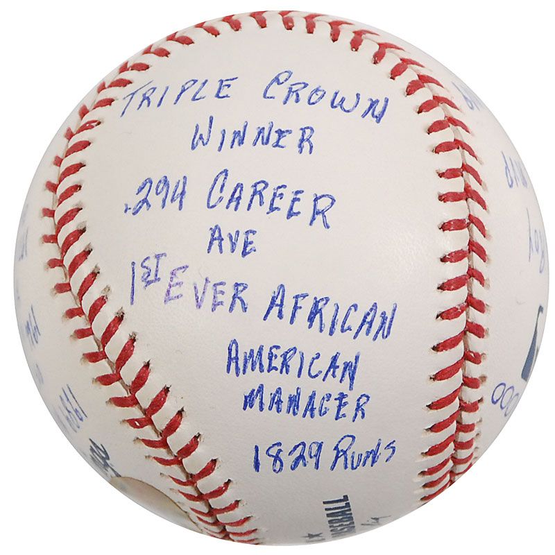 Limited edition official Rawlings Major League baseball, numbered 263/1000, signed in blue ballpoint on the sweet spot, “Frank Robinson, HOF 82.” Robinson has also filled the side panels with 15 statistics from his career, including “586 Home Runs,” “1956 NL ROY,” “1966 AL MVP,” “1st Ever African American Manager,” and “Triple Crown Winner.” In very fine condition. Accompanied by a certificate of authenticity from Reggie Jackson’s ‘statball’ company, as well as the item’s original velvet bag and box.