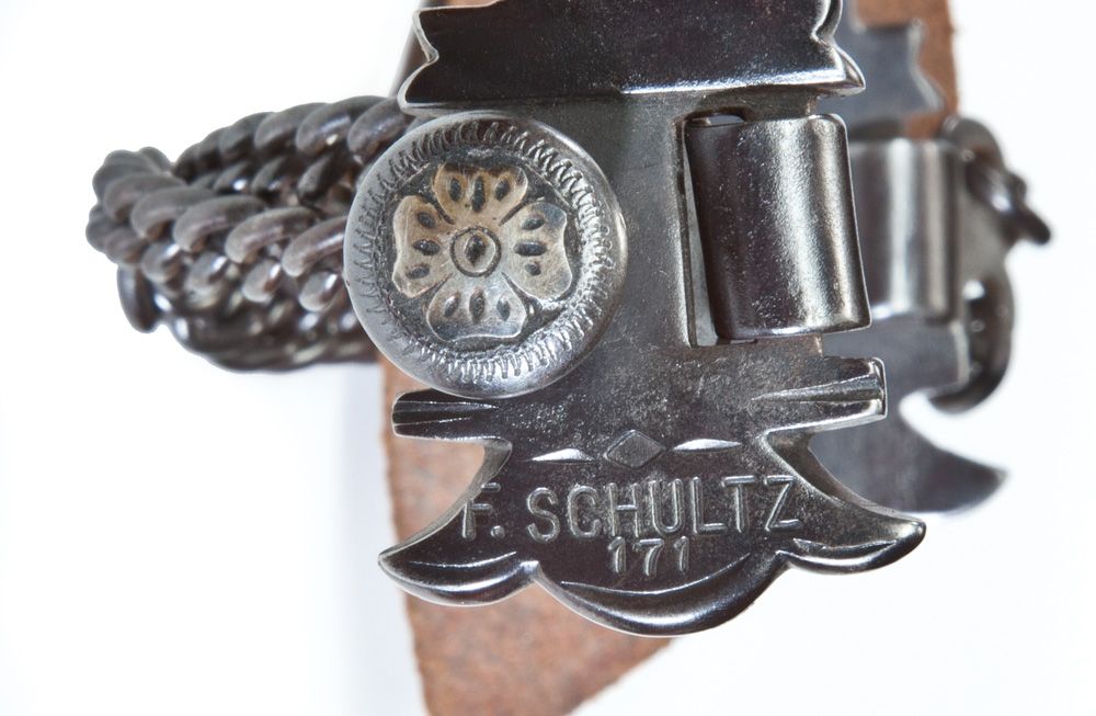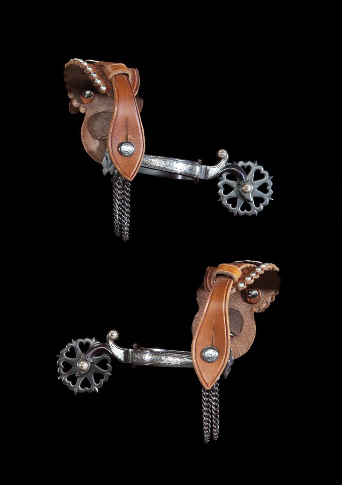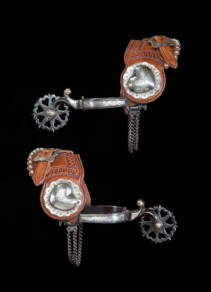 Fancy Spanish style spurs with sterling inlay on both sides of the tapered bands, 2 1/2” cut-out heart rowels and silver accents. Numbered 171 and dated 1996. Two-piece tooled and studded straps with F. Schultz marked straps and large 2 3/8” heart conchos.