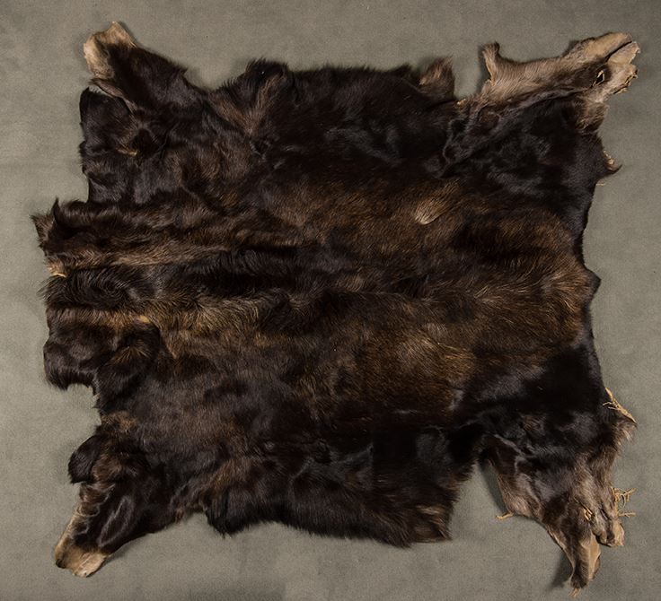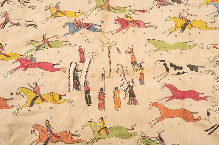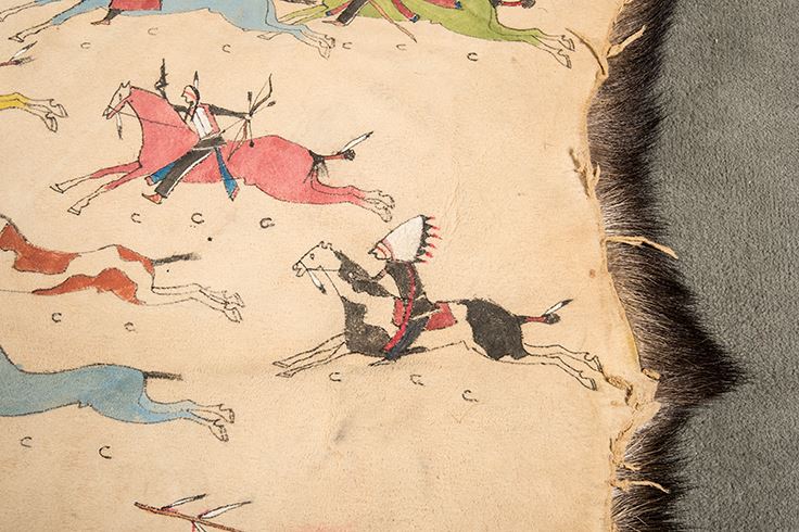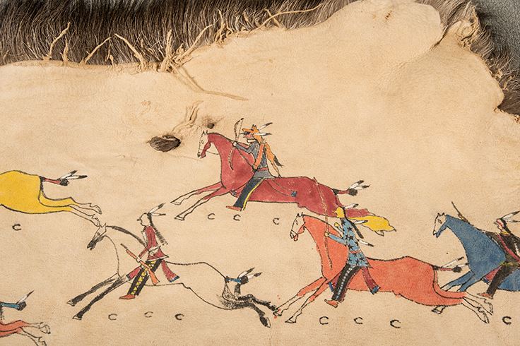Frank Shorty Painted Moose Hide. 58" x 75". A wonderful, contemporary painting on moose hide depicting a major battle scene with 80 horses. Signed and dated '93 in the lower right corner: Frank Shorty. Frank Shorty was a Sioux/Navajo artist.