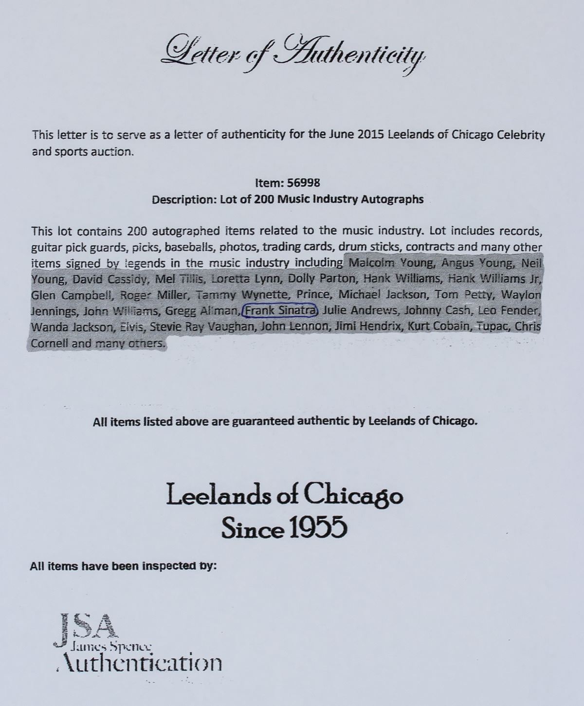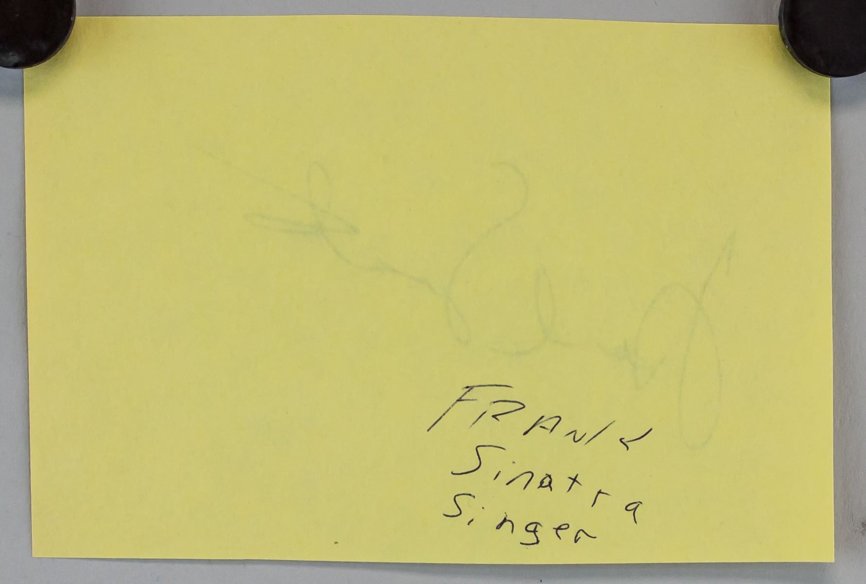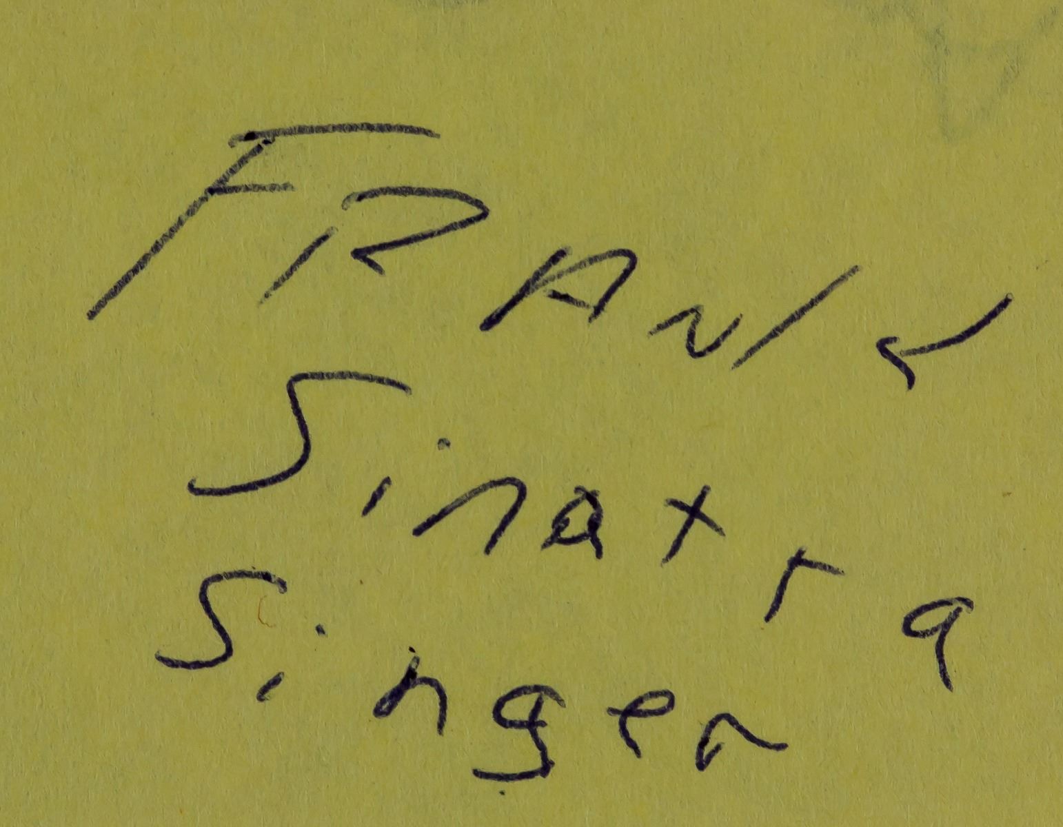 Autograph on paper, signed Frank Sinatra (1915-1998, American) and inscribed FRANK Sinatra singer on verso. Accompanied with a James Spence Authentication JSA letter. Photograph not included in the lot