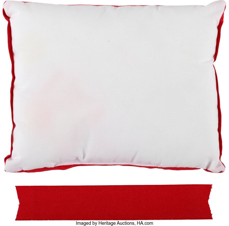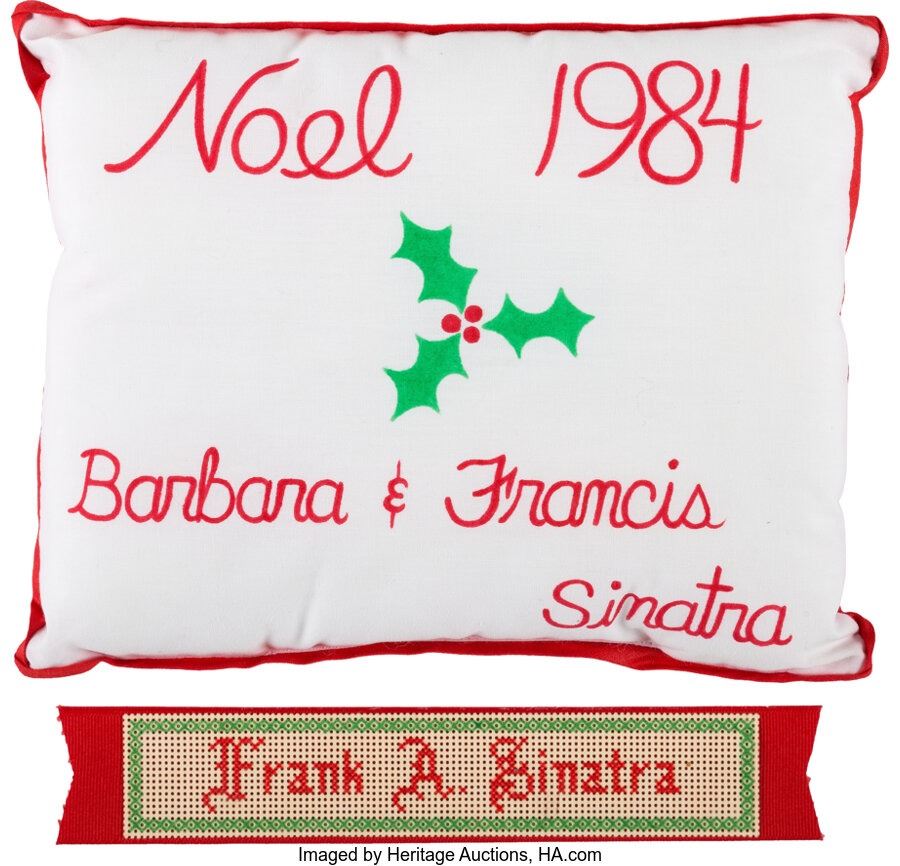 Frank Sinatra Christmas Pillow and Ribbon. Two Christmas-themed items from Ol' Blue Eyes. Lot includes: 1)A small, 7 ¼" x 9 ½" pillow with "Noel 1984 / Barbara Francis / Sinatra" printed on the front. In Near Mint condition; 2)A 9" ribbon with "Frank A. Sinatra" printed on the front. In Near Mint Minus condition with fraying on the ends. COA from Heritage Auctions.