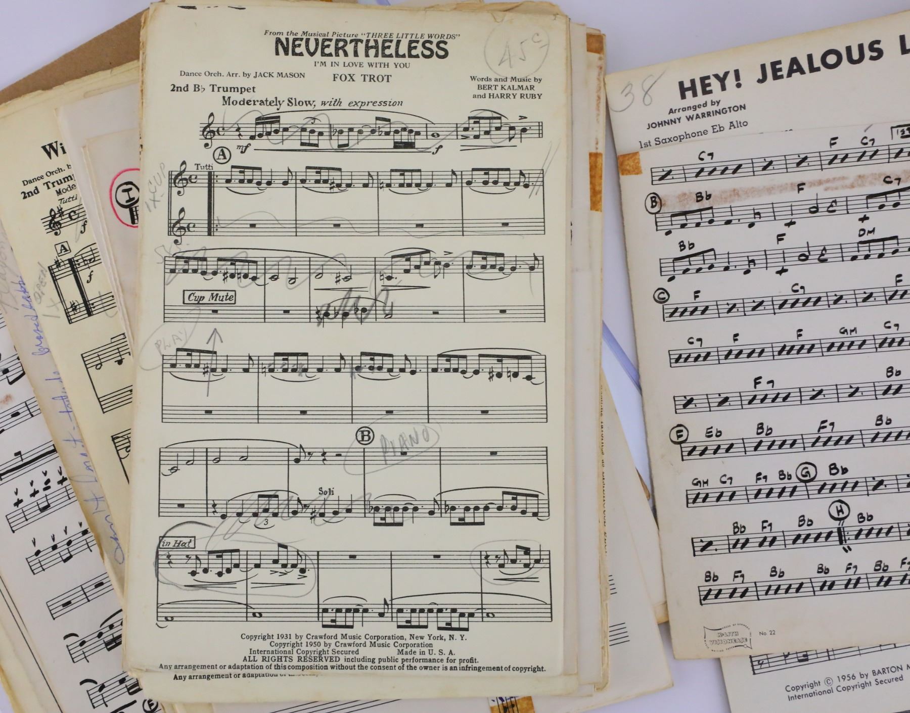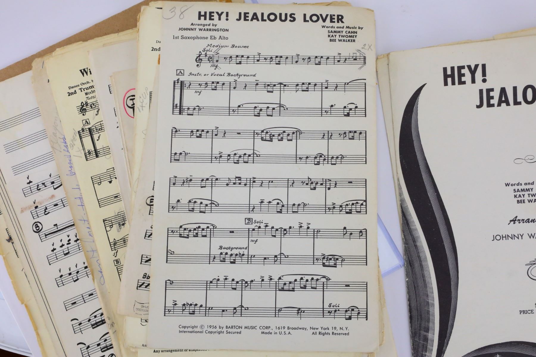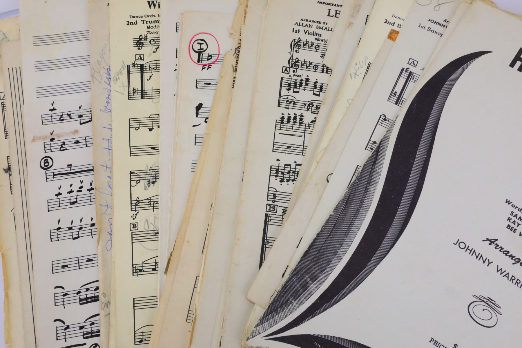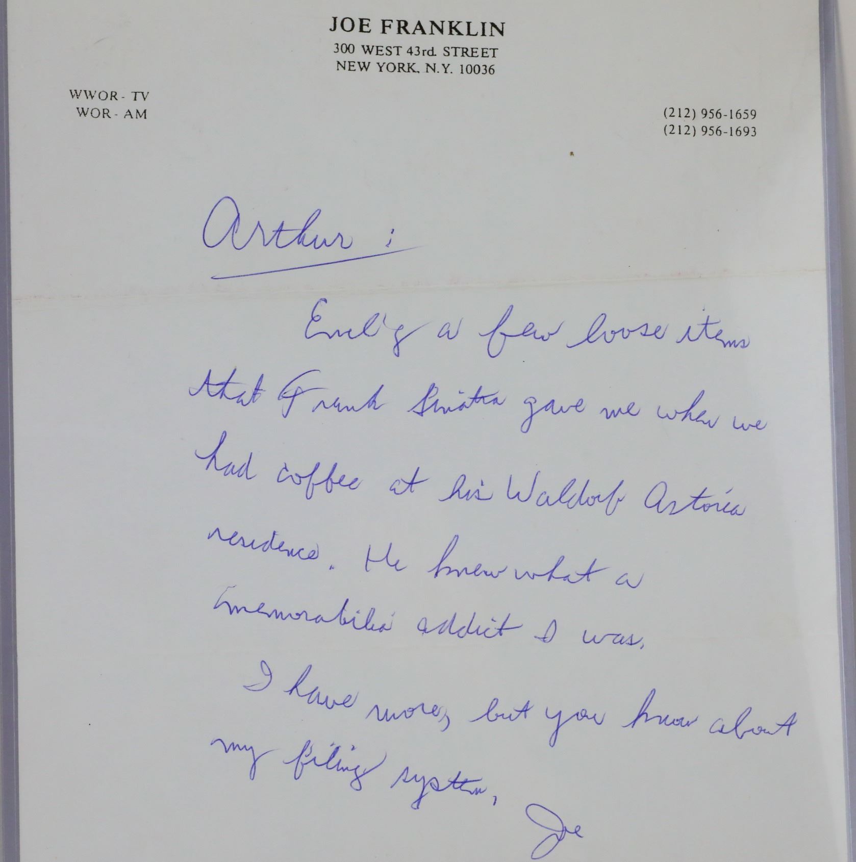 Frank Sinatra Collection of Orchestra Sheet Music W/Hand Written Notes From The Joe Franklin Memory Lane Collection W/LOA - This is a collection of sheet music for Frank Sinatra's orchestra. There are multiple sheets, many of which have hand written notes and annotations. The music was acquired from the collection of Joe Franklin, the legendary American radio and television host personality, author and actor, whose show featured famous guests such as Andy Warhol, Elvis Presley, Marilyn Monroe, Salvador Dali, John Lennon and Yoko Ono, and countless others. Franklin had a love of collecting momentos from his guests, and would ask each guest to leave him a personal item, many of which would oblige. The music will be accompanied by a hand written letter from Franklin. Frank Sinatra (1915-1998) was an American singer, actor, and producer who was one of the most popular and influential musical artists of the 20th century. He had a successful career as both an actor and musician, and is one of the best-selling music artists of all time, having sold more than 150 million records worldwide. Sinatra was honored at the Kennedy Center Honors in 1983, awarded the Presidential Medal of Freedom by Ronald Reagan in 1985, and the Congressional Gold Medal in 1997. He also earned eleven Grammy Awards, including the Grammy Trustees Award, Grammy Legend Award and the Grammy Lifetime Achievement Award, "the greatest singer of the 20th century". Frank Sinatra continues to be seen as an iconic cultural icon today.