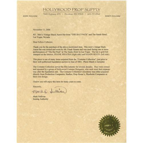 <B>Frank Sinatra Owned Hat.</B></I> A black Aaron brand fedora owned and worn by Frank Sinatra, with his name and "Sands Hotel" embossed on the sweatband. In Very Fine to Excellent condition with minor wear.<I>Accompanied by LOA from Hollywood Prop Supply.</B></I><BR><BR><b>Shipping:</b> Clothing, Costumes & Jerseys (<a target="_blank" href="http://www.heritageauctions.com/common/shipping.php">view shipping information</a>) <BR><BR><B>Important no