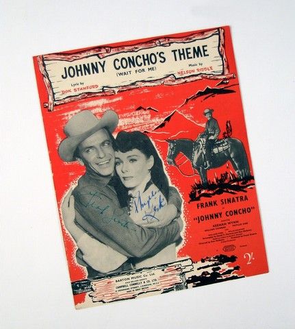 The 1956 western "Johnny Concho" is best known for its theme song "Wait For Me", written by the long-time Sinatra collaborator, Nelson Riddle. The movie starred Sinatra and Phyllis Kirk. This is the original sheet music personally autographed by Frank Sinatra and Phillips Kirk at the time of the release of the movie. Early signatures of super-stars are extremely valuable. It comes from the Estate of composer Clark Gesner ("You're A Good Man Charlie Brown"), who was one of the biggest private collectors with over 10,000 autographs in his collection. Comes with a LOP informational Letter.