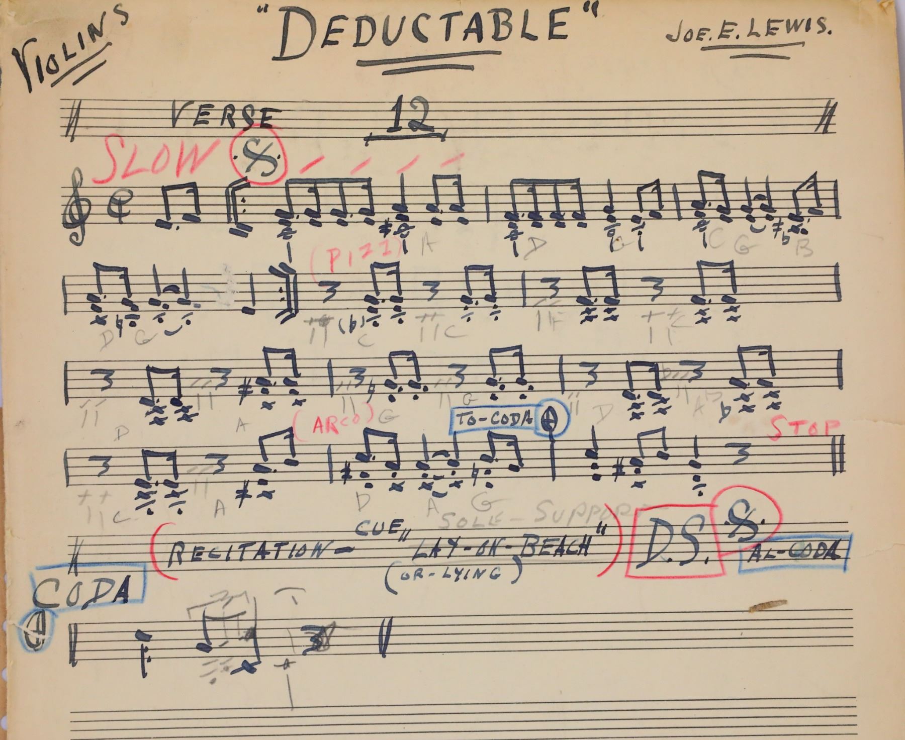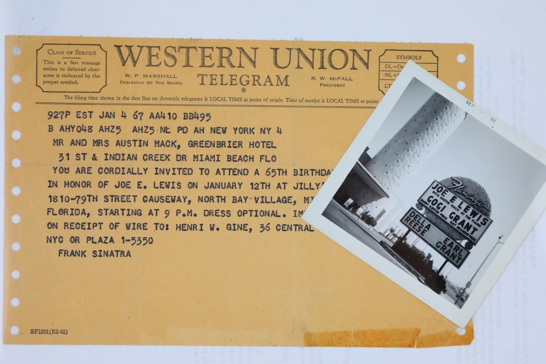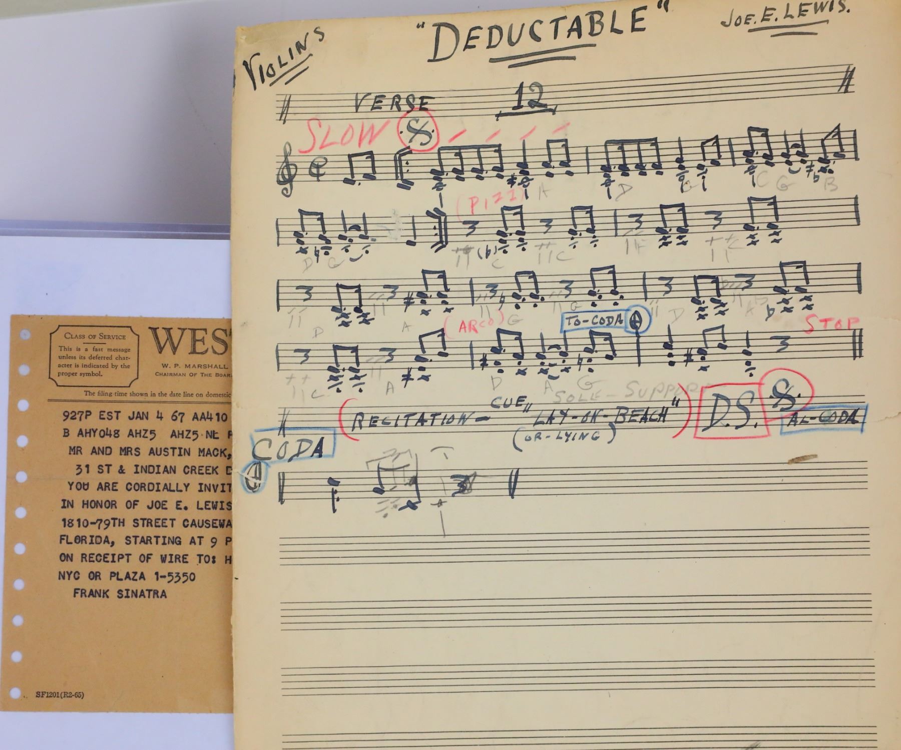 Frank Sinatra Prep Sheet Music From "The Joker is Wild" From The Joe Franklin Memory Lane Collection W/LOA - This is a collection of prep material that was personally used by legendary performer Frank Sinatra to prepare for his role as comedian Joe E. Lewis in the 1957 film "The Joker is Wild". The collection includes hand written sheet music, a photograph and a joke telegram sent to Sinatra by Lewis himself. These items were acquired from the collection of Joe Franklin, the legendary American radio and television host personality, author and actor, whose show featured famous guests such as Andy Warhol, Elvis Presley, Marilyn Monroe, Salvador Dali, John Lennon and Yoko Ono, and countless others. Franklin had a love of collecting momentos from his guests, and would ask each guest to leave him a personal item, many of which would oblige. These items will be accompanied by a letter of authenticity from Franklin. Frank Sinatra (1915-1998) was an American singer, actor, and producer who was one of the most popular and influential musical artists of the 20th century. He had a successful career as both an actor and musician, and is one of the best-selling music artists of all time, having sold more than 150 million records worldwide. Sinatra was honored at the Kennedy Center Honors in 1983, awarded the Presidential Medal of Freedom by Ronald Reagan in 1985, and the Congressional Gold Medal in 1997. He also earned eleven Grammy Awards, including the Grammy Trustees Award, Grammy Legend Award and the Grammy Lifetime Achievement Award, "the greatest singer of the 20th century". Frank Sinatra continues to be seen as an iconic cultural icon today.