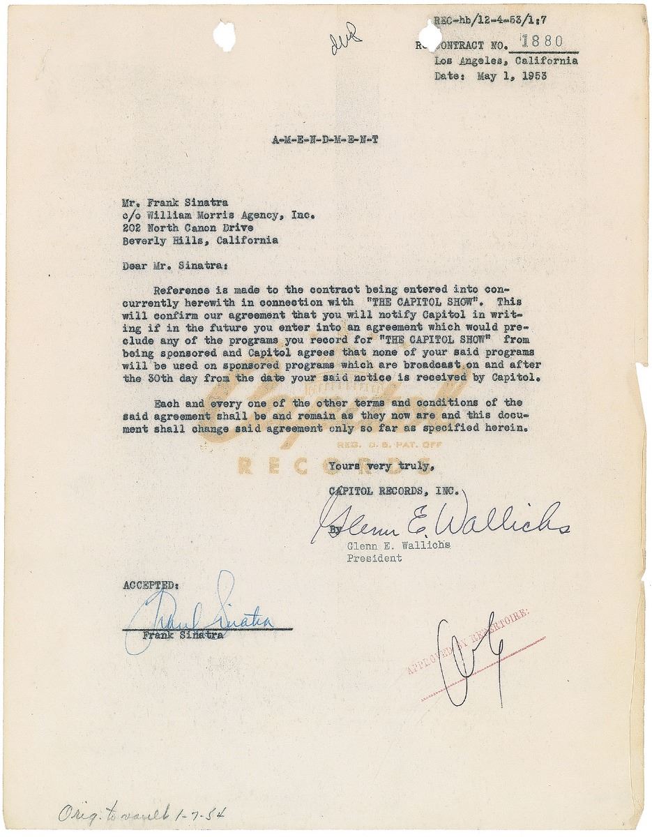 DS, one onionskin page, 8.5 x 11, May 1, 1953. An amendment to an agreement between Capitol Records and Sinatra, in which the latter agrees to notify Capitol of any future agreements “which would preclude any of the programs you record for ‘The Capitol Show’ from being sponsored.” Signed at the conclusion in blue ballpoint by Sinatra, and countersigned in black ink by Capitol Records President Glenn E. Wallichs. In fine condition, with some minor edge tears.