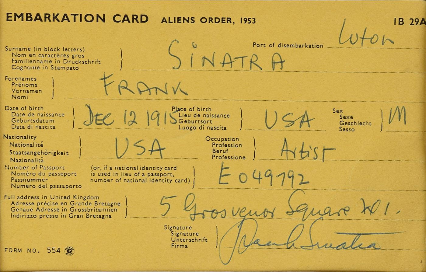 DS, one page, 5.75 x 3.75, stamp-dated July 15, 1966. United Kingdom customs embarkation card that Sinatra fills out entirely in his own hand. The various fields, as follows: Port of Disembarkation: "Luton," Surname: "Sinatra," Forename: "Frank," Date of Birth: "Dec 12, 1915," Place of Birth: "USA," Sex: "M," Nationality: "USA," Occupation: "Artist," Passport Number: "E049792," and Full Address in United Kingdom: "5 Grosvenor Square W1." Signed at the conclusion by Sinatra. Matted with a photo of Sinatra to an overall size of 11.75 x 15.75. In fine condition. This customs card dates to a busy period in Sinatra's career; his single, 'Strangers in the Night' was sitting at the top of charts in both America and the UK, he was busy flying between the two countries for filming of the espionage film The Naked Runner, and, just four days after this card was stamped, Sinatra married actress Mia Farrow on July 19, 1966.