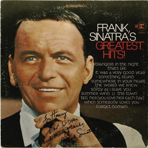 <B>Frank Sinatra Signed Greatest Hits LP.</B></I> This 1965 re-issue of the 1961 release "Frank Sinatra's Greatest Hits!" is inscribed "For Henry, Best wishes and many thanks" and signed by Sinatra in black marker. The cover is in VG condition with a 7" seam split on top, and the record is in VG++ condition.