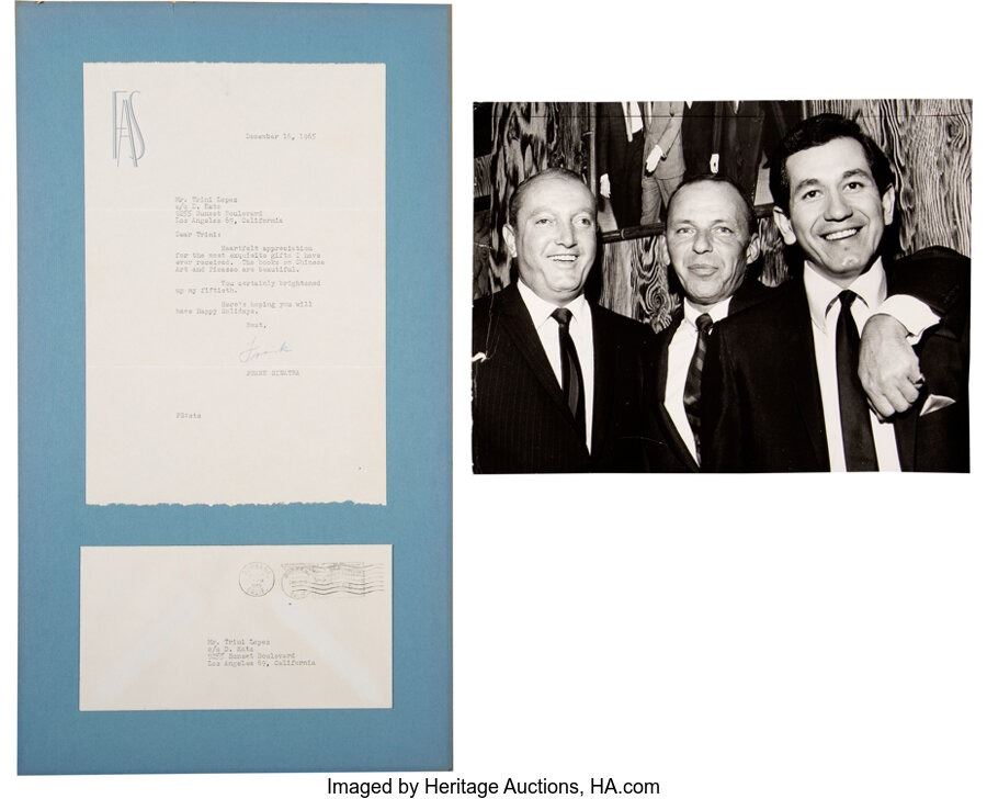 Frank Sinatra Signed Letter to Trini Lopez. Attached to blue backing board, this letter on "FAS" stationary is dated December 16, 1965 and signed by Ol' Blue Eyes with a blue ballpoint pen. Comes with original envelope. Overall, measures 10 ½" x 18 ¾". Overall, in Very Good Plus condition with some edgewear on the backing board. Also comes with a 12" x 9" black and white photo featuring Frank and Trini. In Very Good condition with tears and creasing along the left side. COA from Heritage Auctions.