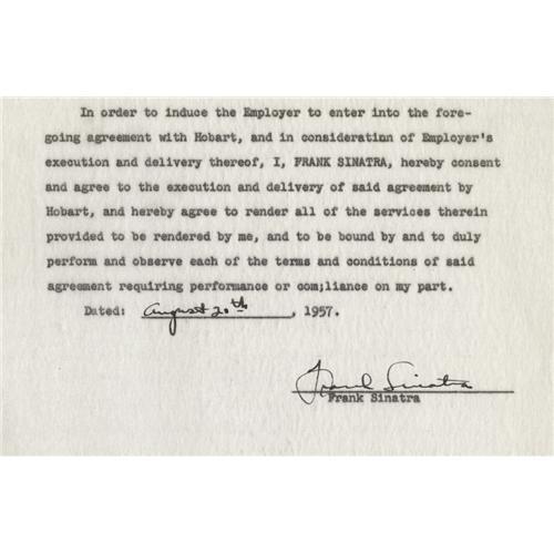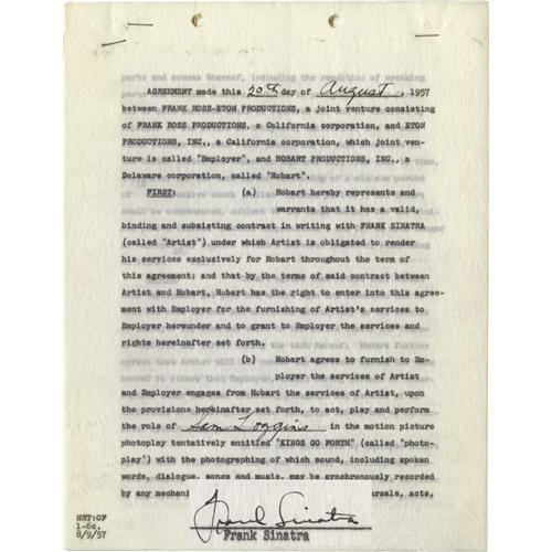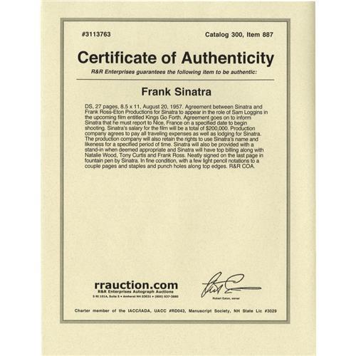 <B>Frank Sinatra Signed Movie Contract - 1957.</B></I> A 27-page agreement, dated August 20, 1957, between Sinatra and Frank Ross-Eton Productions, engaging Sinatra to appear in <I>Kings Go Forth</B></I> for a salary of $200,000. Neatly signed on the last page by Sinatra in in fountain pen, and in Fine condition with a few light pencil notations, and staple and binder holes along the top edges. <I>Accompanied by a certificate of authenticity.</B></I><I>Accompanied by LOA from PSA/DNA.</B></I><BR><BR><b>Shipping:</b> Small Flat (<a target="_blank" href="http://www.heritageauctions.com/common/shipping.php">view shipping information</a>)