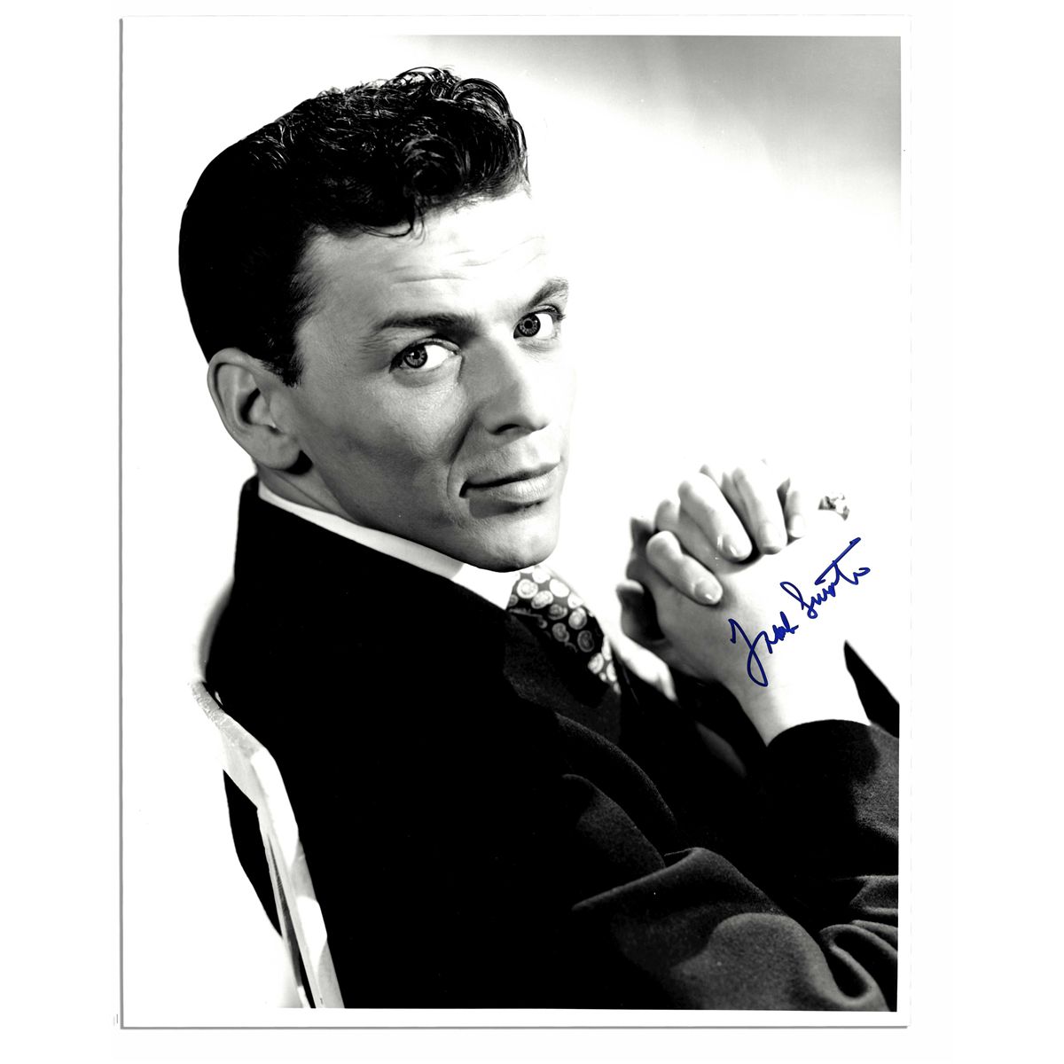 Signed 11'' x 14'' glossy photo of a young, alluring Frank Sinatra, probably from the late 1940's. Clear, bold signature in blue ink reads: ''Frank Sinatra''. Minor edge creasing, else near fine condition. With COA from in-person autograph specialist Michael Wehrmann.