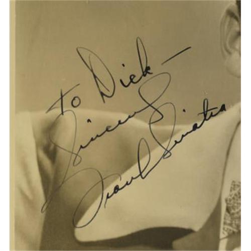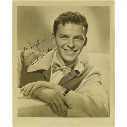 <B>Frank Sinatra Signed Photo.</B></I> A great b&w 8" x 10" photo of a young Sinatra, in Very Fine condition with mild to moderate toning and mild wear around the edges. <I>Accompanied by LOA from PSA/DNA.</B></I><BR><BR><b>Shipping:</b> Flat Material, Small (<a target="_blank" href="http://www.heritageauctions.com/common/shipping.php">view shipping information</a>)