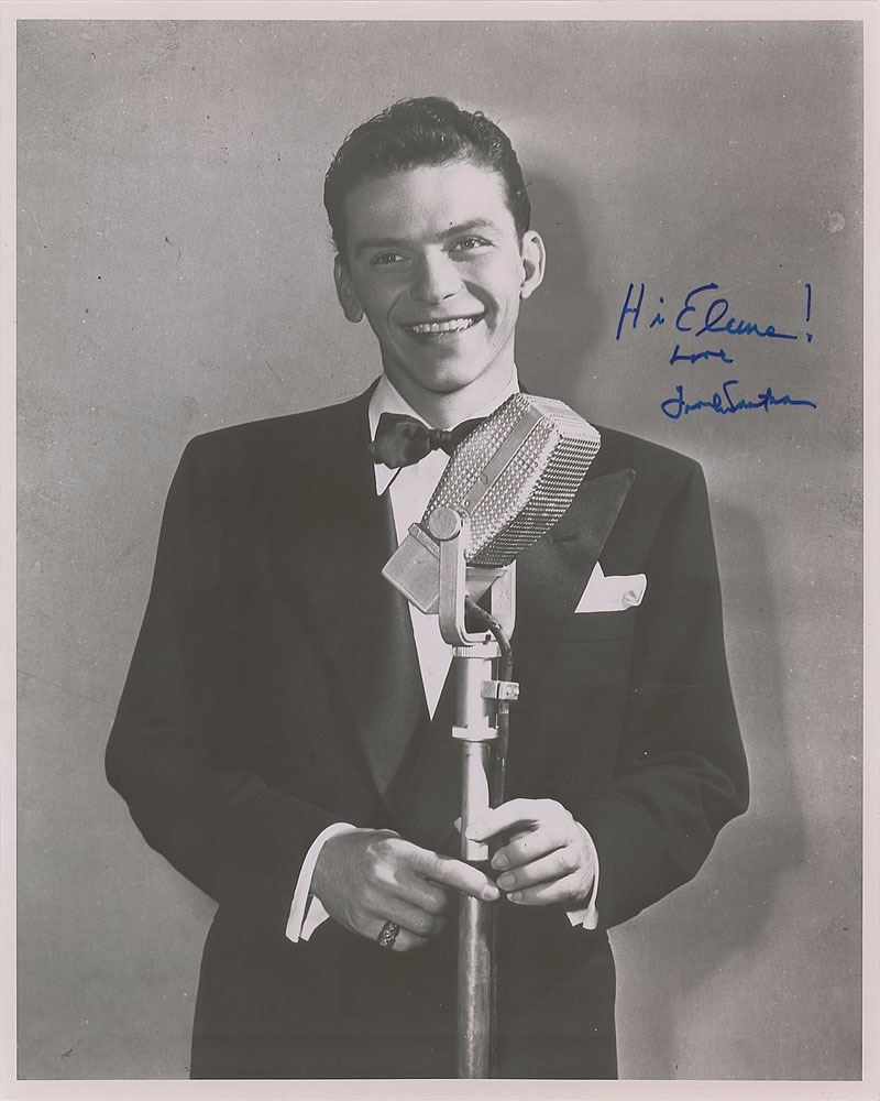 Very appealing satin-finish 11 x 14 half-length photo of the young crooner smiling behind a microphone, signed and inscribed in blue felt tip, "Hi Elaine!, Love, Frank Sinatra.” In fine condition, with trivial wear to upper right corner.