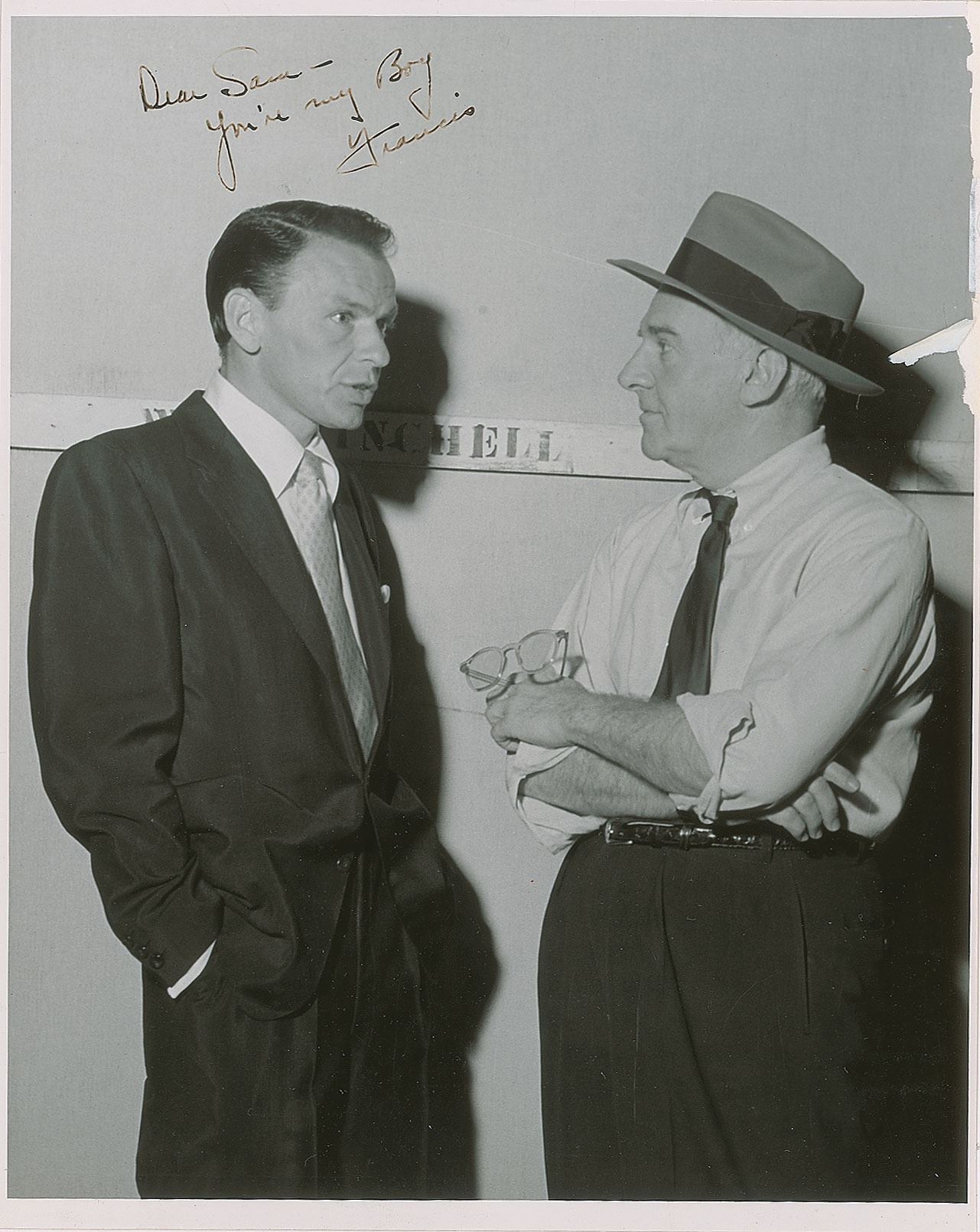 Vintage glossy 8 x 10 photo of Sinatra standing and speaking with columnist Walter Winchell, signed and inscribed in fountain pen, "Dear Sam—You're my Boy, Frank Sinatra.” Reverse bears a Bill Mark credit stamp. In very good to fine condition, with trimmed edges, and an emulsion tear to the right edge. Although unfounded, this photo was potentially inscribed to Chicago mob boss Sam Giancana, with whom Sinatra and Winchell were both friends.