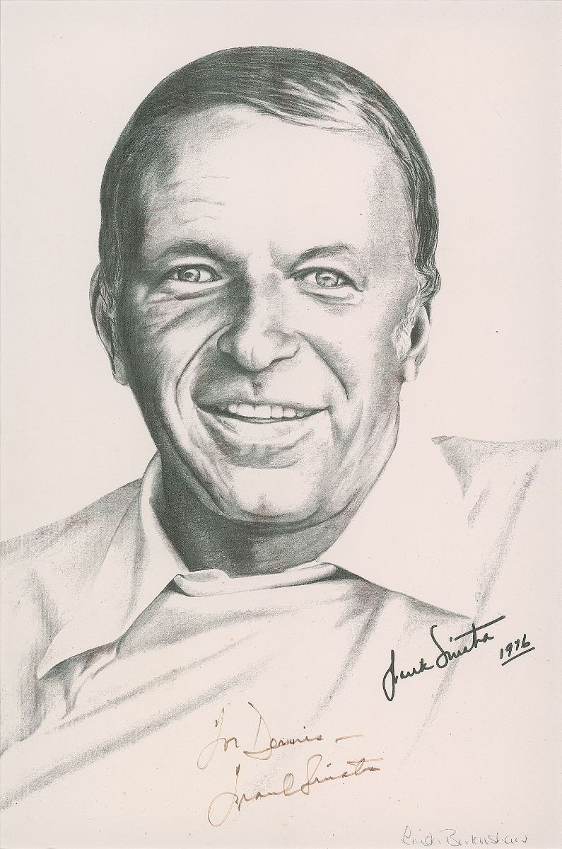 An 8 x 11.75 printed sketch of Sinatra, signed and inscribed in brown felt tip to his driver Dennis Parker, “To Dennis—Frank Sinatra.” A printed secretarial signature is also inherent to the print. Matted and in fine condition. Parker was Sinatra’s driver during his tours of Britain and Europe for twenty-five years, becoming one of the singer’s close friends.