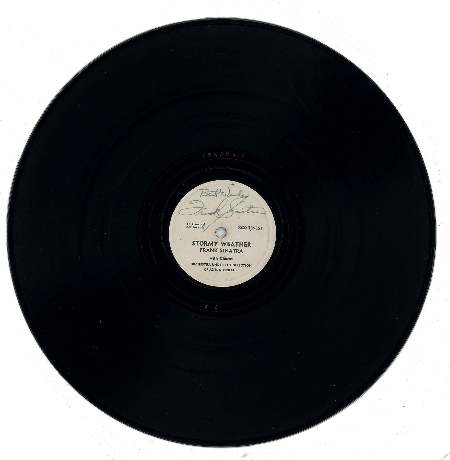 Scarce 12˝ shellac test pressing record for 'Stormy Weather / Ol' Man River,' beautifully signed on the label in fountain pen, "Best Wishes, Frank Sinatra." The label notes, "Not For Sale," and that the recordings were done with Axel Stordahl's orchestra. In fine condition.
